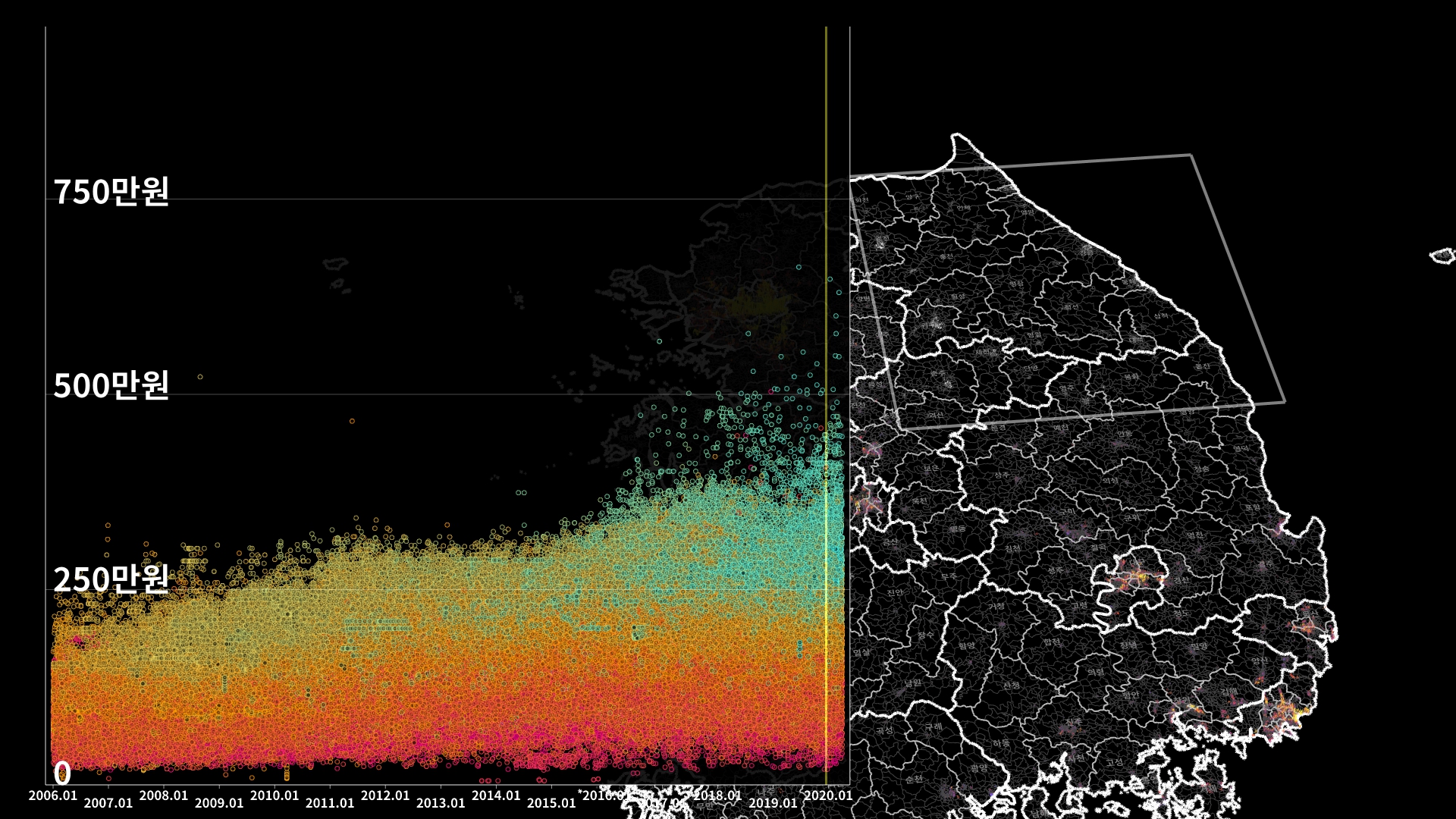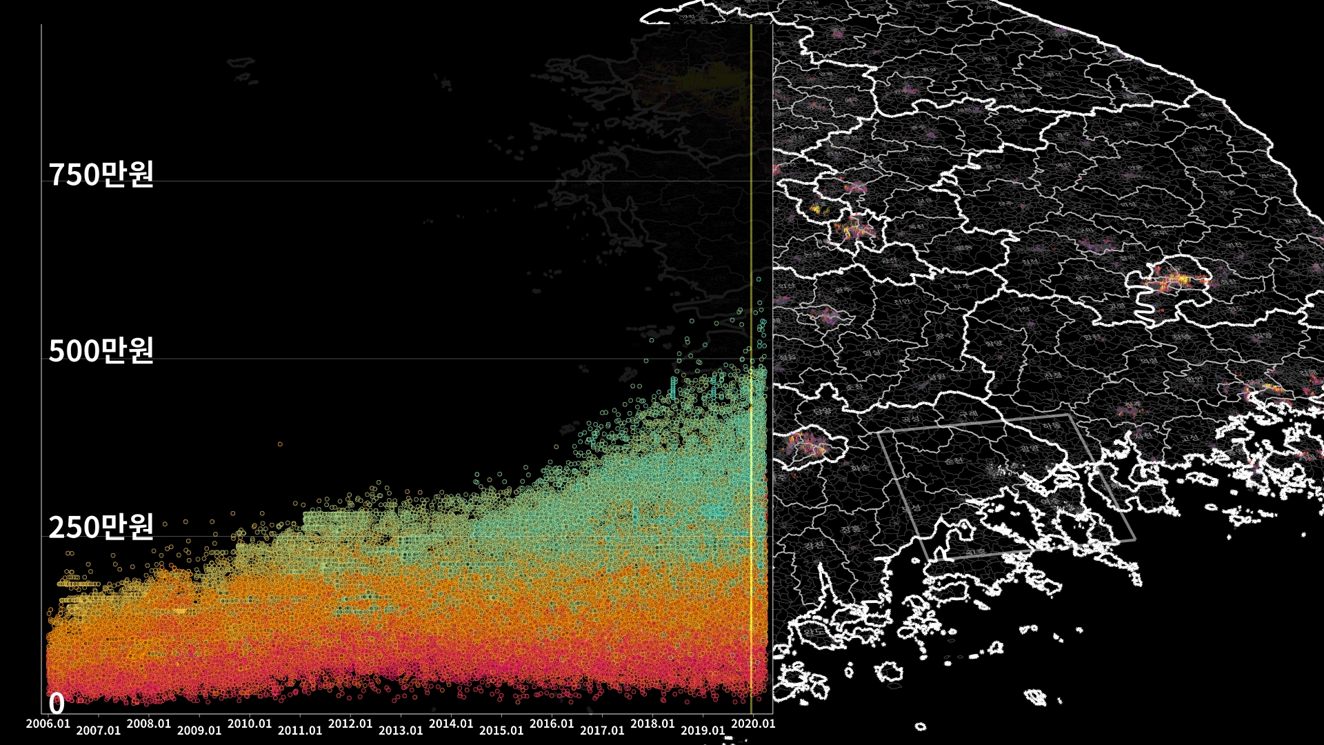 붉은색, 즉 지어진 지 40년쯤 된 오래된 아파트들은 단위면적당 가격이 가장 낮고, 신축아파트 가격은 여섯배가 넘는 것 같다.