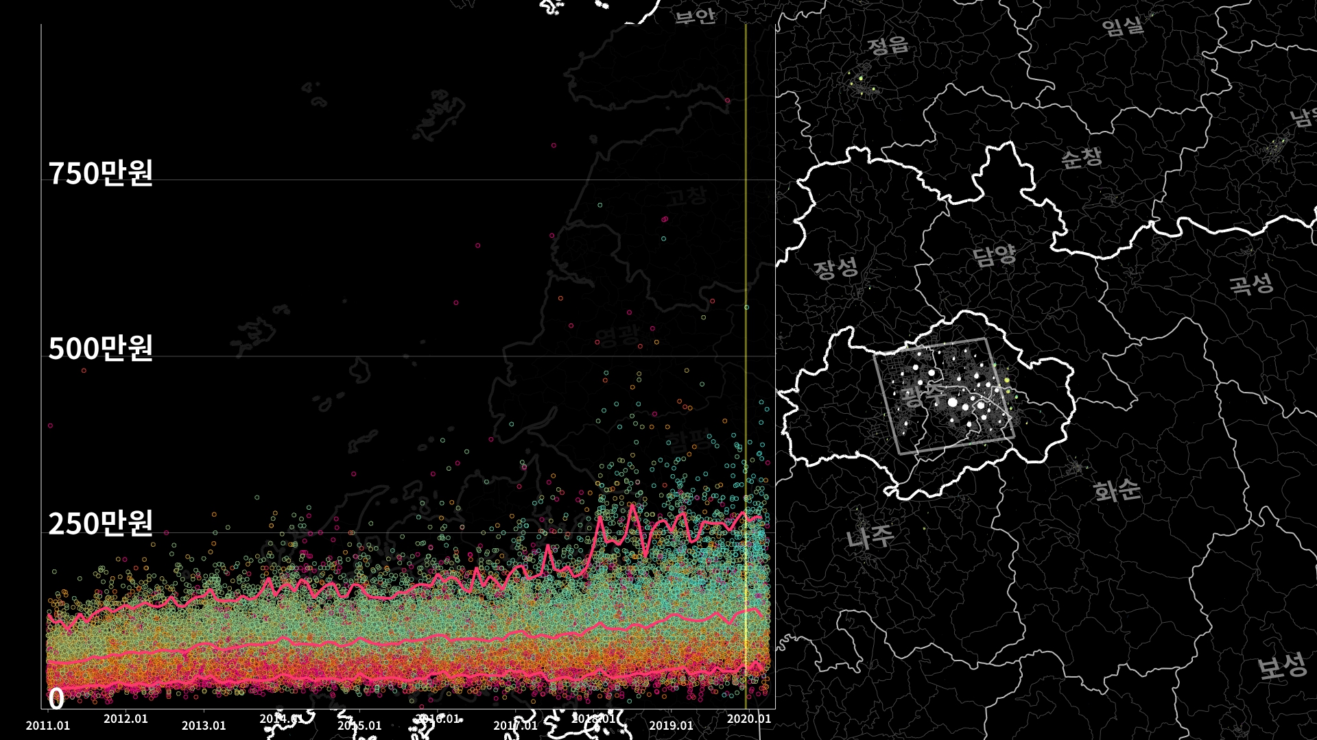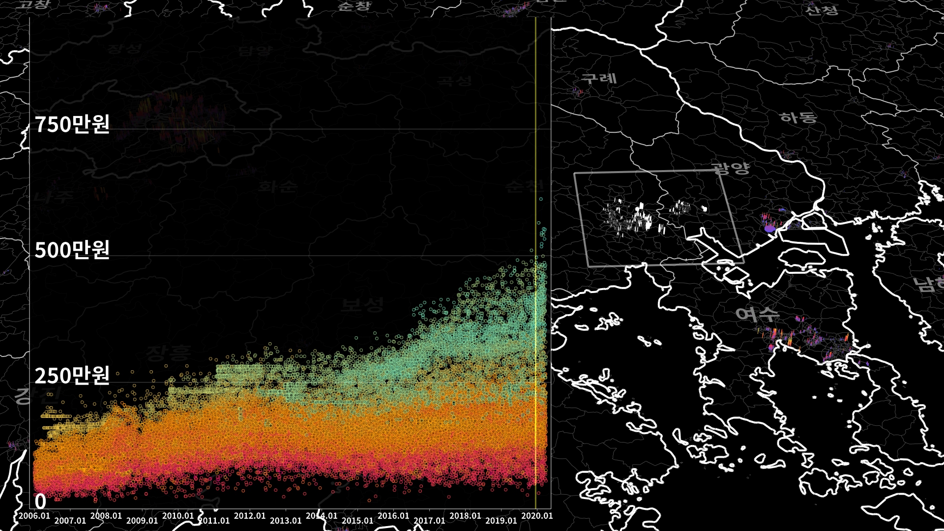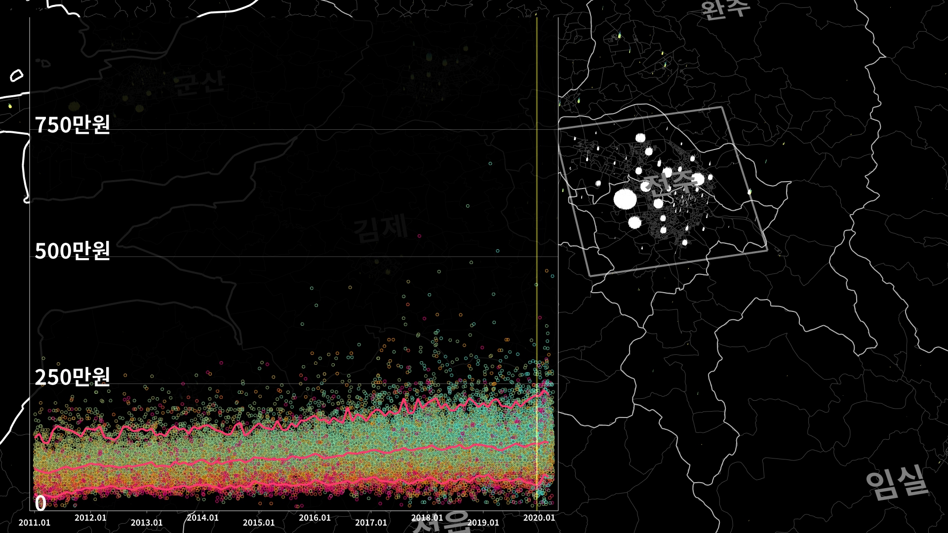 위의 그래프를 보면 최근 들어 군산의 아파트 가격 상위 10%가 급상승한 것처럼 보인다. 이게 틀린 말은 아니지만, 아파트 가격은 단지마다 상황이 다르고 배타적으로 가격이 형성되기 때문에, 그저 상위 10% 가격이라고 하면 개별적인 사실들이 녹아있는 데이터의 많은 부분을 놓치게 되어버린다.