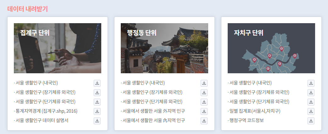 위의 메뉴에서 서울생활인구(내국인)과 통계지역경계(집계구.shp, 2016)을 내려받으면 된다.