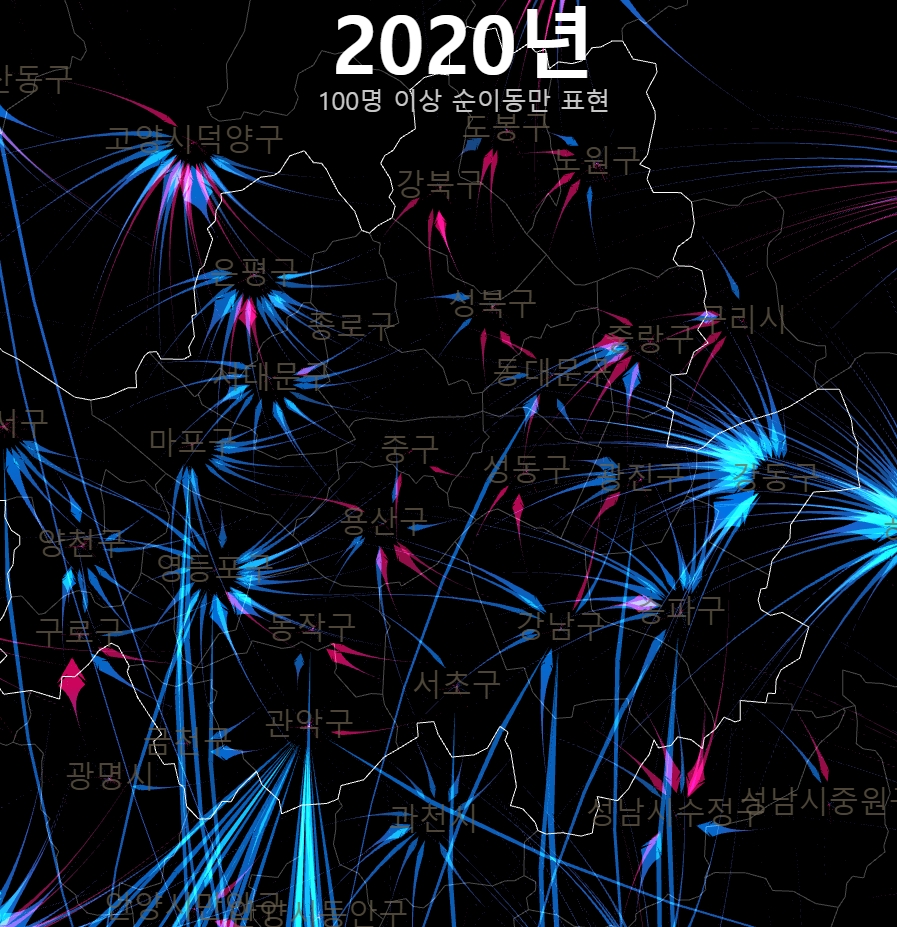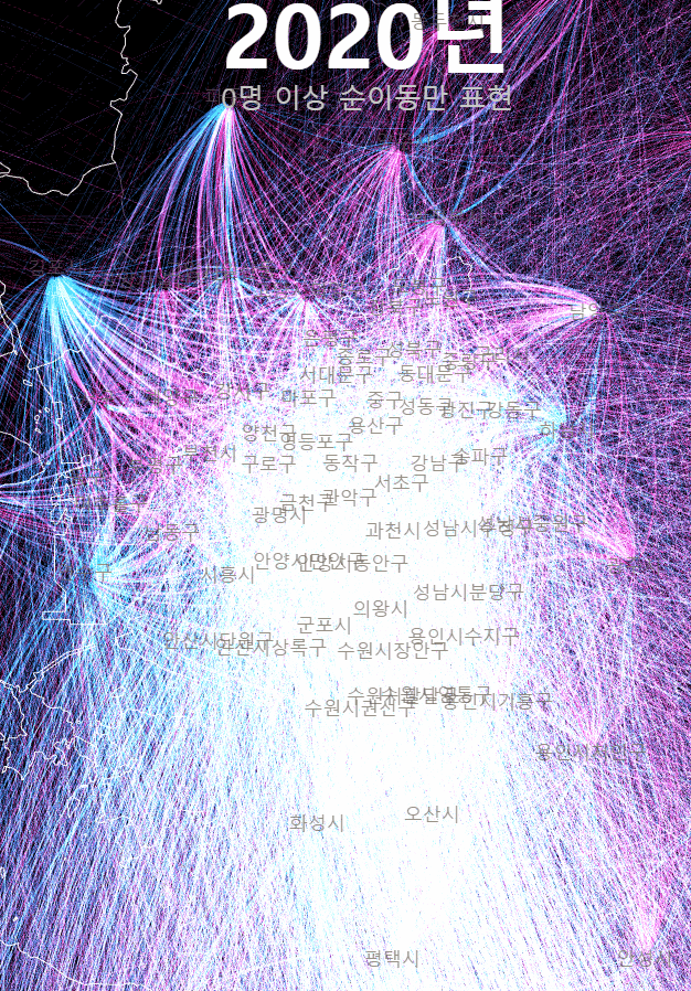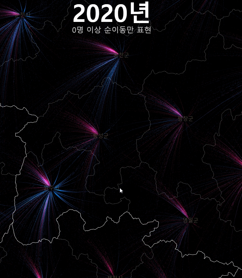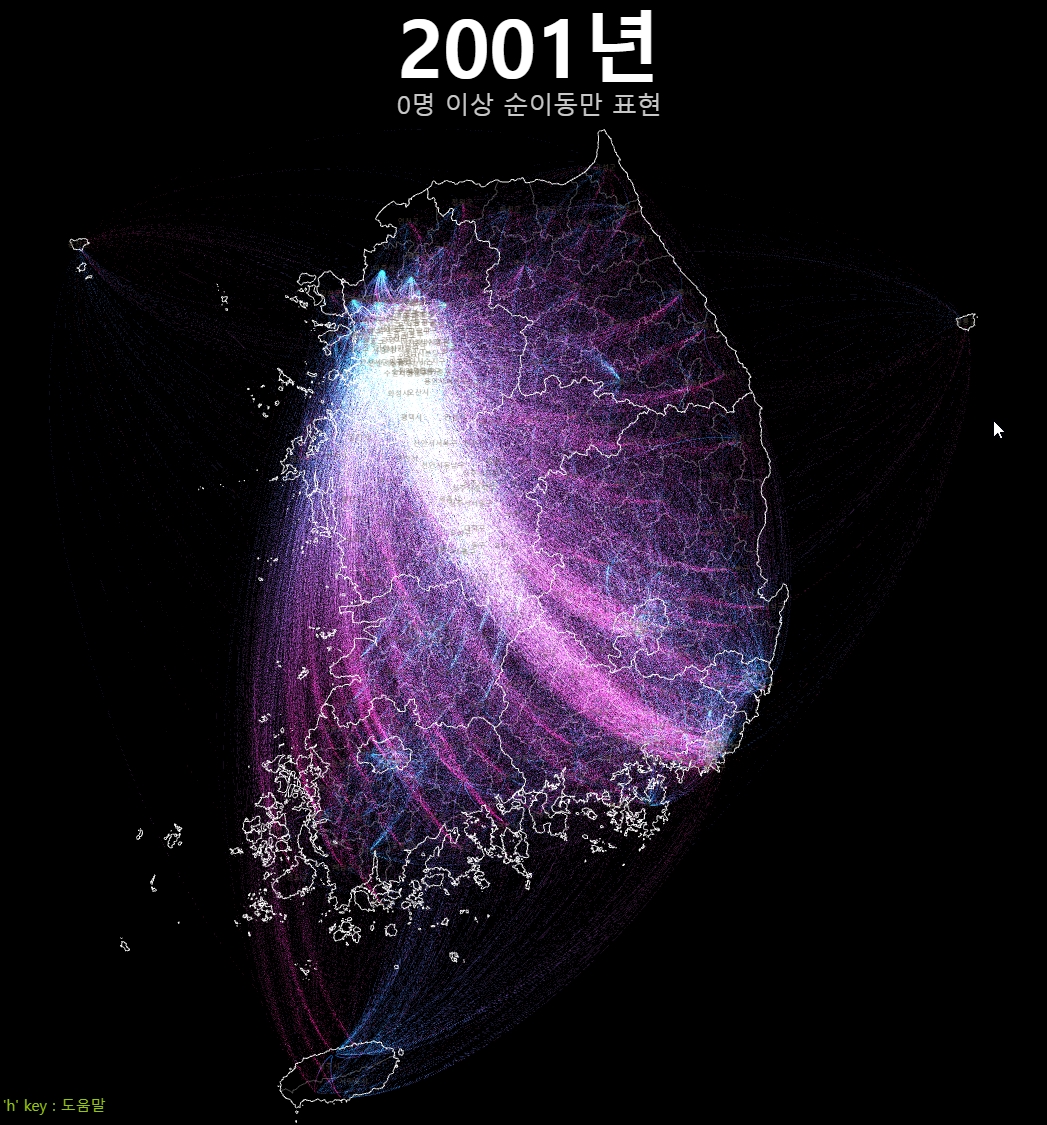 여기까지 20년간 시군구간 순이동 시각화를 매개로 OD시각화에서의 고민과 인구 이동이라는 특수한 대상에서의 표현의 문제를 다뤄보았다. 인구 이동 양상은 지금 우리 사회에서 매우 중요한 문제다. 누군가는 이 글을 읽고 이 데이터에 좀 더 친숙하게 다가갔으면 했다. 기약은 없지만, 이 시각화는 시간날때마다 조금씩 업데이트 해 볼 생각이다.