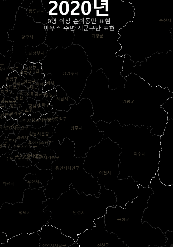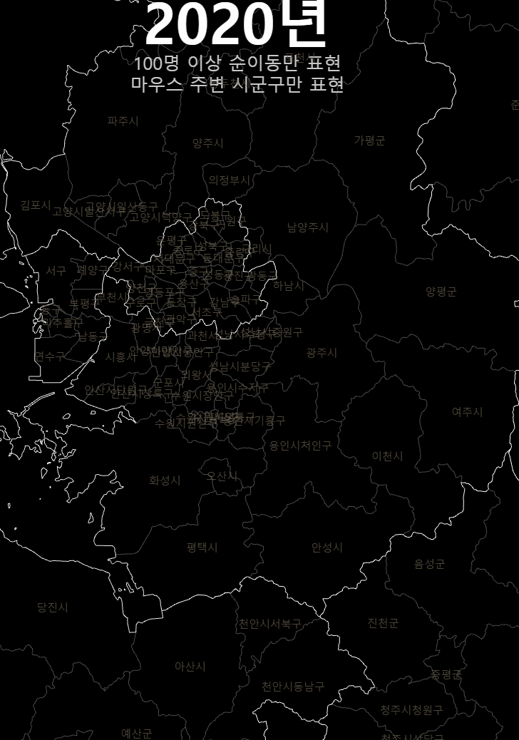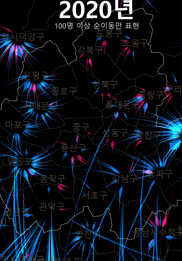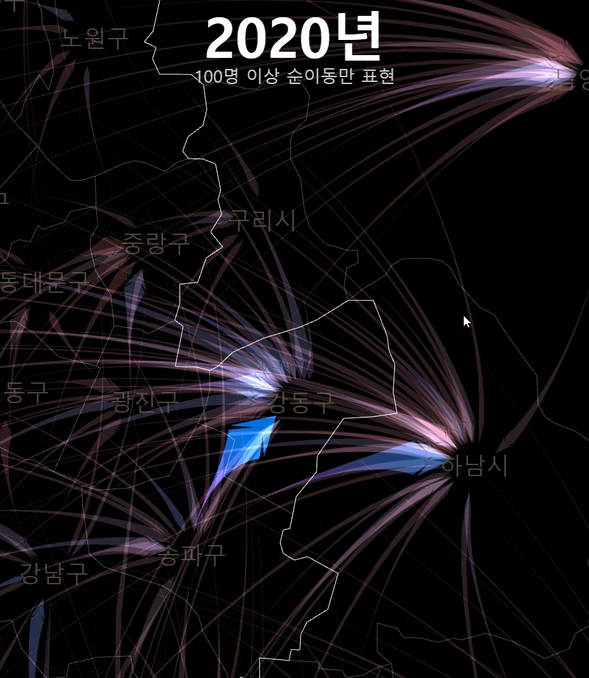 여기까지 20년간 시군구간 순이동 시각화를 매개로 OD시각화에서의 고민과 인구 이동이라는 특수한 대상에서의 표현의 문제를 다뤄보았다. 인구 이동 양상은 지금 우리 사회에서 매우 중요한 문제다. 누군가는 이 글을 읽고 이 데이터에 좀 더 친숙하게 다가갔으면 했다. 기약은 없지만, 이 시각화는 시간날때마다 조금씩 업데이트 해 볼 생각이다.