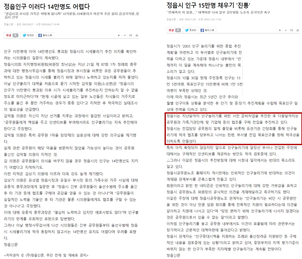 지방교부세 때문에 연말에 억지로 전입을 시도한 것이다. 인구가 줄어가니 15만명을 유지하기 위해 방학때를 이용하여 미취학 아동이나 초등학생들을 정읍으로 전입시켜 인구를 채운 후, 개학하기전에 다시 돌려보냈던 것 같다. 물론 서류상으로겠지.