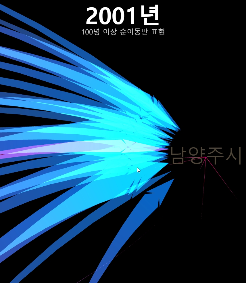 이 인구이동 시리즈는 그 동안 C++/OpenGL로 작업하다가, 그래도 내용상으로 좀 더 공유할 가치가 있다는 생각이 들어 온라인 버젼으로 옮겨보았다. webGL에는 지오메트리 셰이더가 없어서 생각보다 좀 더 고생을 했는데, 여튼 비슷한 수준의 결과물로 바꿔볼 수 있었다.
