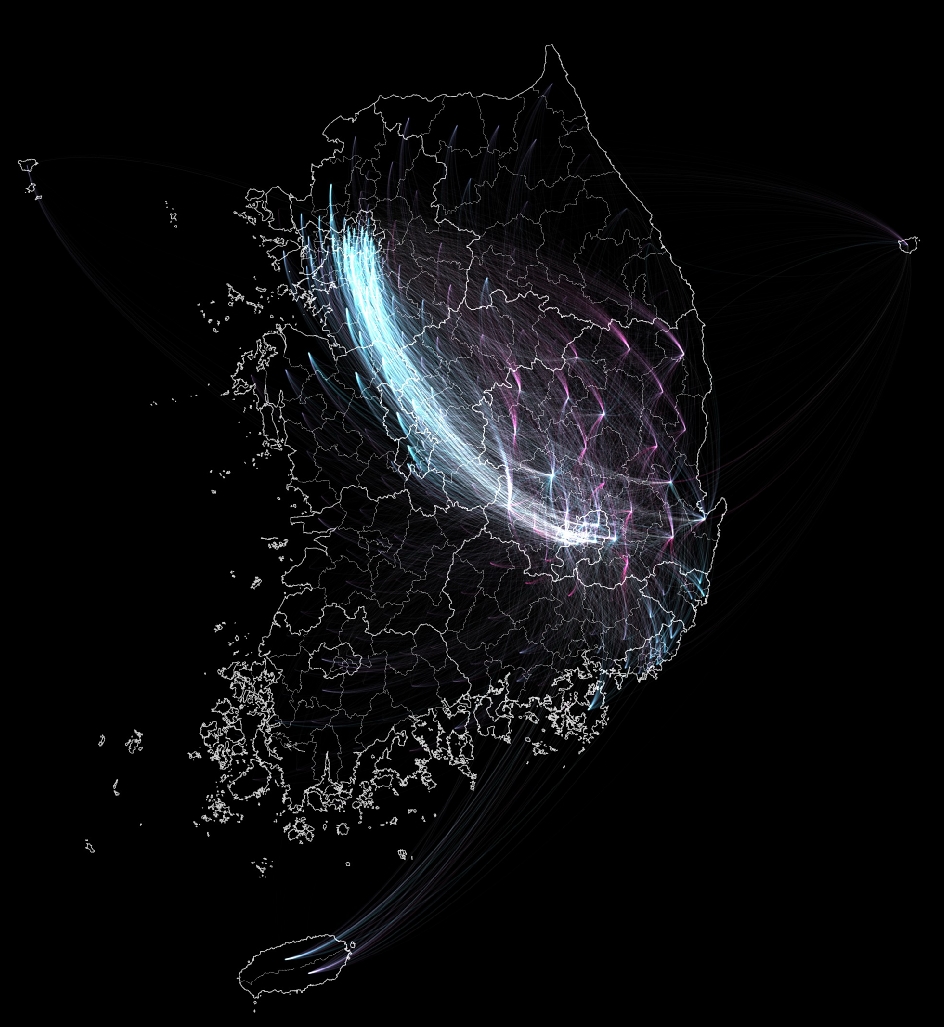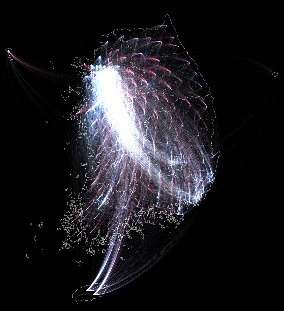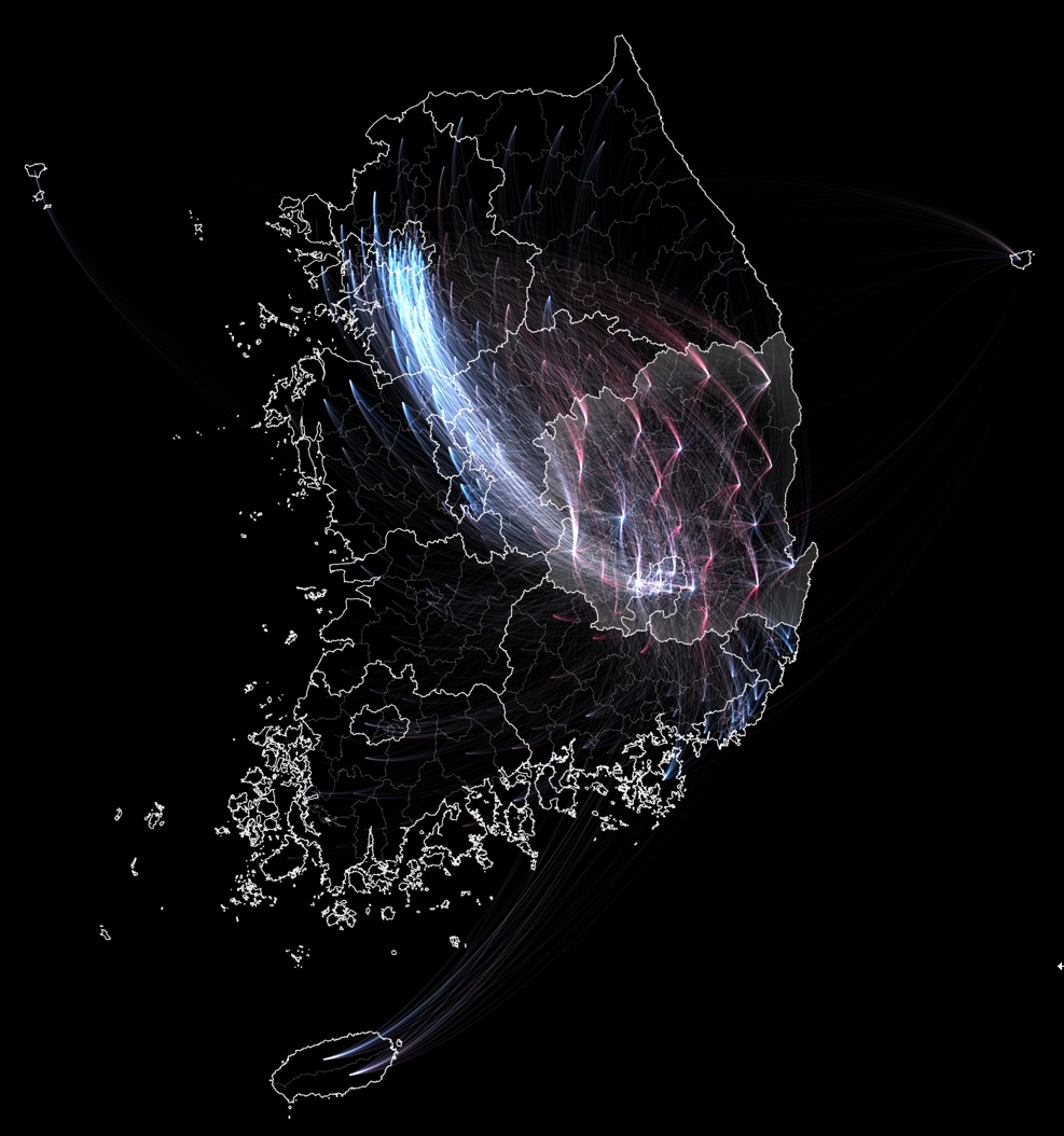 당시의 시행착오가 모두 남아있지는 않지만, 예를 들어 출발지의 색상을 조금만 밝게 해도 아래처럼 되어버린다. 대구 부분이 좀 더 하얗게 되어 메시지가 불명확해지고 서울로 가는 선들이 뭉쳐져서 잘 구분되지 않는다.