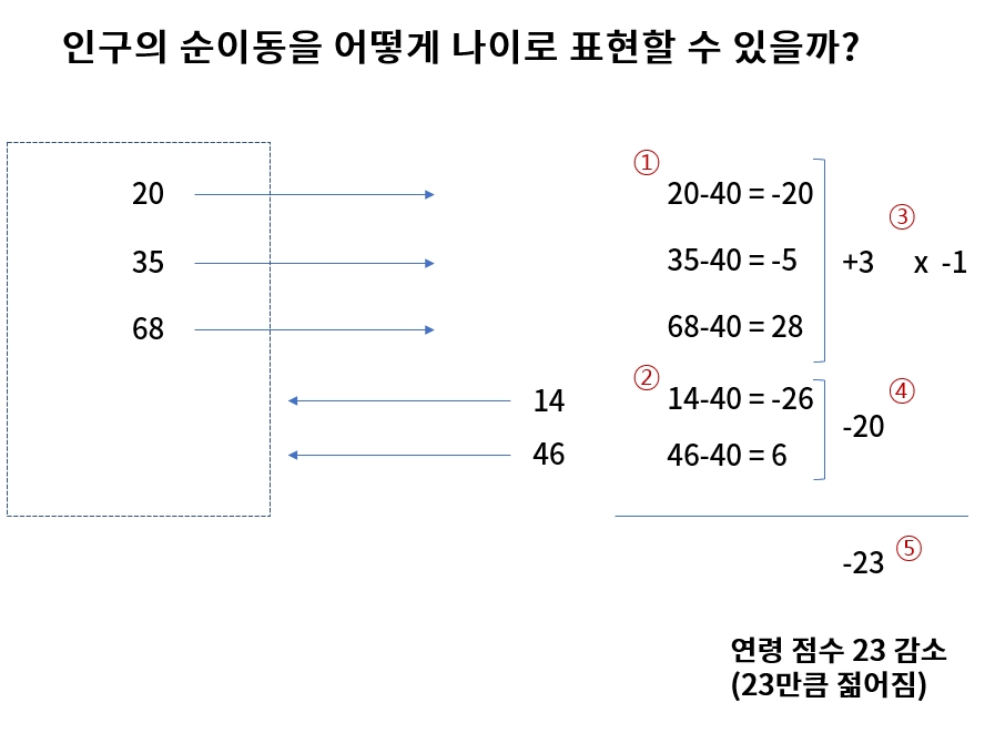 그 밖에도 여러 해의 순이동을 표현할 때 일괄적으로 40세로 할 것인지, 각 해의 평균 나이로 할 것인지 선택해야 하는데, 여기서는 일괄적으로 40세로 했다. 이 점은 여기에서처럼 '퉁 쳐서 그냥 40세를 기준!' 이라고 정할 때도 좀 많이 고민이 된 부분이다. 그림의 결과가 판이하게 달라졌기 때문이다.