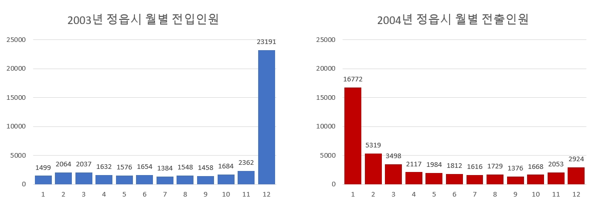 2003년과 2004년을 월별로 집계해보니 위와 같은 말도 안되는 이동이 드러났다. 12월에 23000명이 어디에선가 와서 이듬해 1~3월에 걸쳐 다시 빠져나갔다.