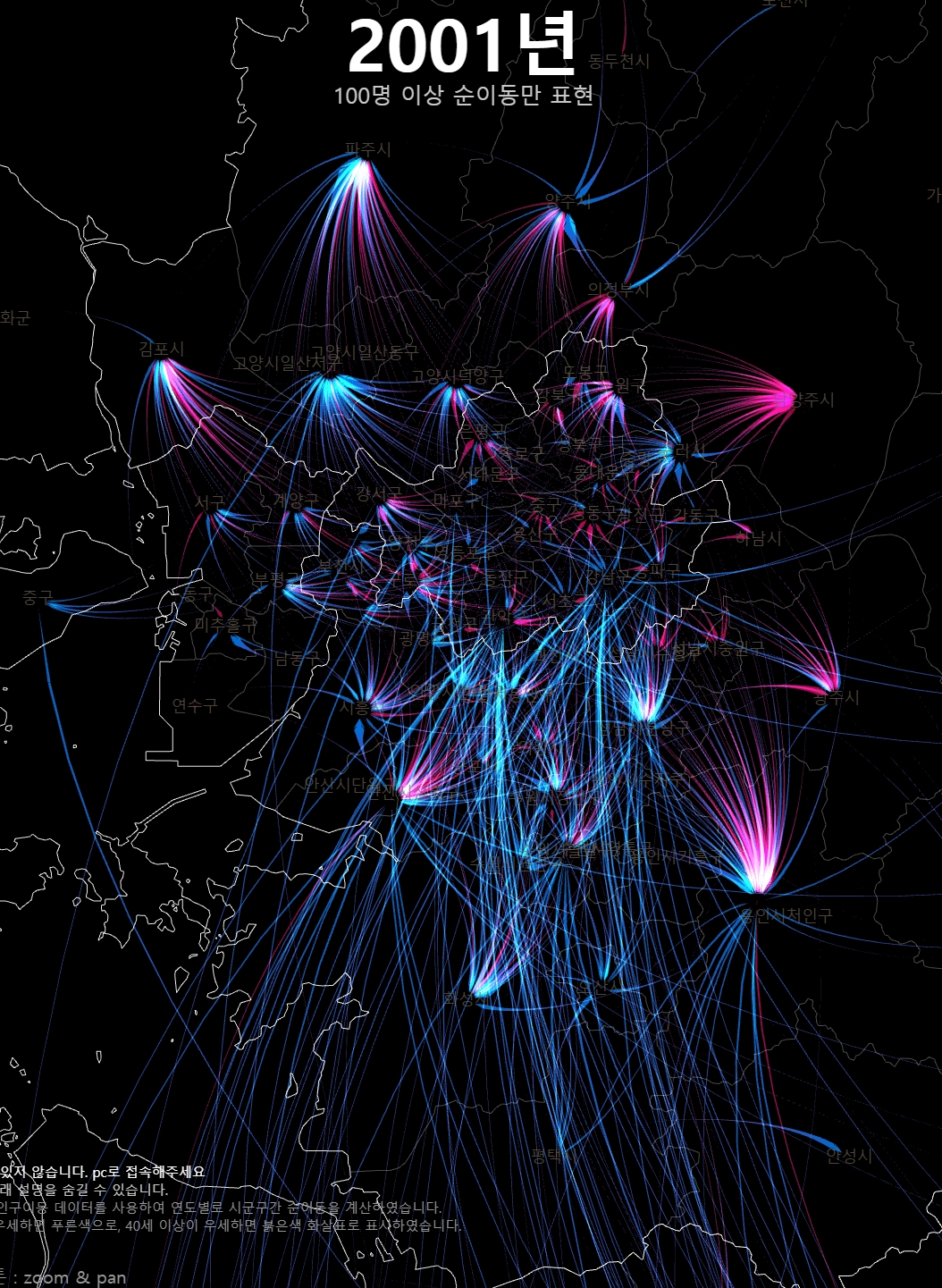 앞의 글에서 여러가지 사례를 들어 OD 시각화에서 고민했던 점들을 썼다면, 이번에는 전국 인구 순이동 시각화를 조작해보면서 설명해보겠다.