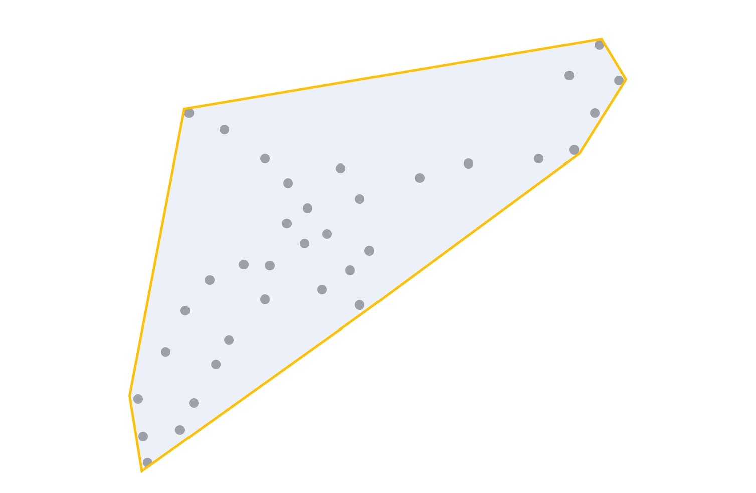 어떤 사람이 한 달 동안 다녀간 곳들을 점으로 표시하면 위와 같은 그림을 그릴 수 있다. 그리고 그 점들을 온전히 포함하는 볼록다각형을 그리면 노란색 선이 된다. 이러한 도형을 컨벡스 헐(convex hull)이라고도 하는데, 여기서는 한 사람의 한 달 궤적을 컨벡스헐로 표현하기로 한다.