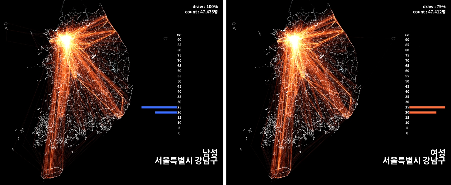 강남구 거주자 중 20대 남녀의 궤적을 비교했다. 숫자를 맞추느라 여성은 좀 덜 그렸다.