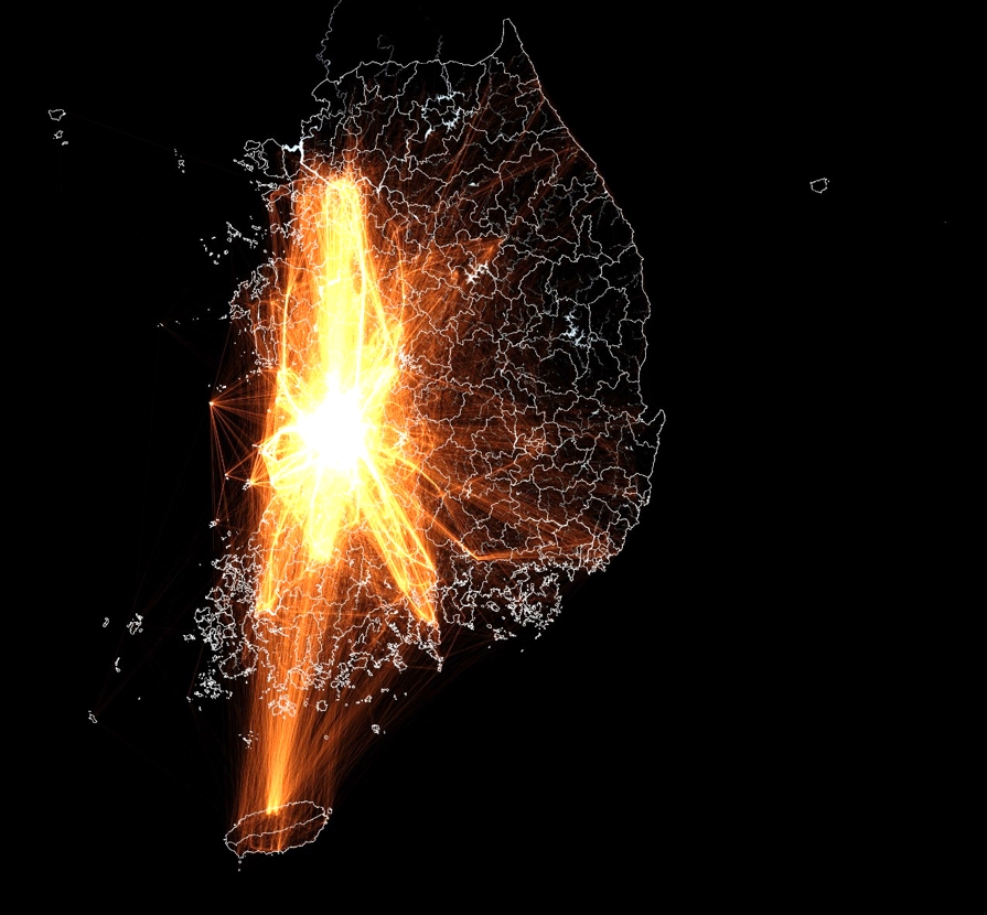 2020년의 어느 한 달 동안 서대문구 거주자들 각각의 이동 범위들을 겹쳐 그리면 위와 같은 그림이 나온다. 당연히 서울 근처에서만 돌아다니는 사람들이 많기 때문에 서울은 노랗게 타버렸다. 좁은 지역보다는 좀 더 넓은 광역 이동을 눈여겨보자.
