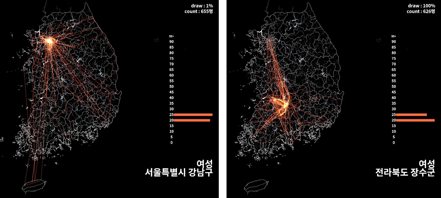 이번에는 똑같은 20대 여성인데 강남구 거주자와 장수군 거주자를 비교해봤다. 숫자를 비슷하게 맞추느라 강남구는 1%만 그렸다.