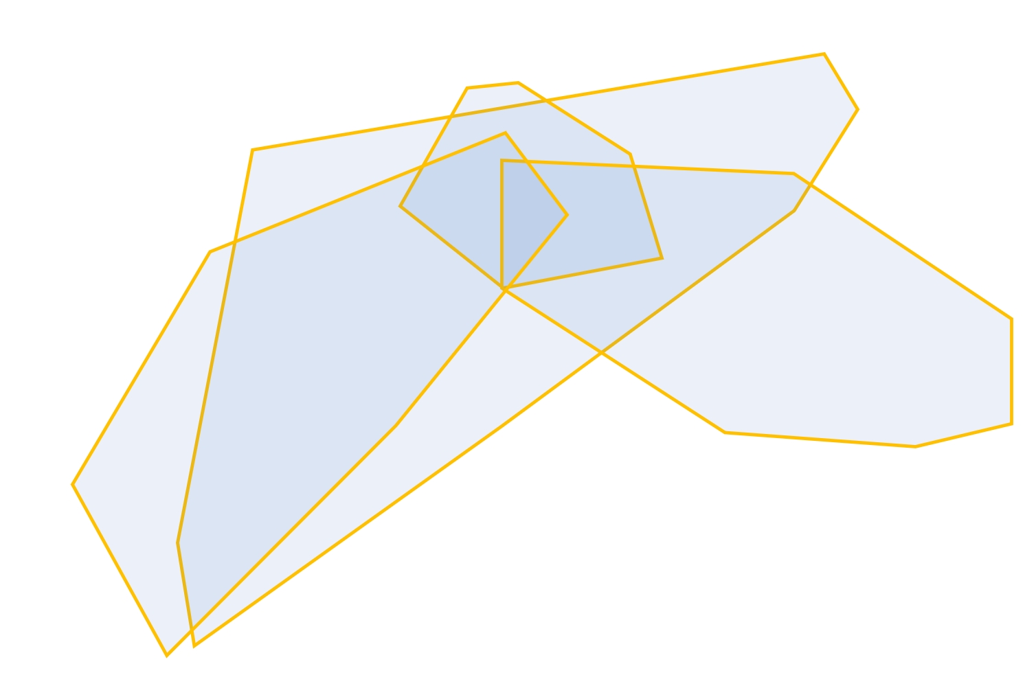 전국을 한 번에 그리면 거의 아무것도 알아볼 수 없을테니, 여기서는 시군구 거주자별로 나누어 그려보겠다. 시군구 거주자들은 매일 잠을 자는 장소가 시군구 경계 안에 있을테니 볼록다각형의 일정 부분을 공유하게 된다. 예를 들어 거주지가 유사한 네 명의 이동 범위를 겹쳐 그리면 위와 같은 모양이 될 수 있다.