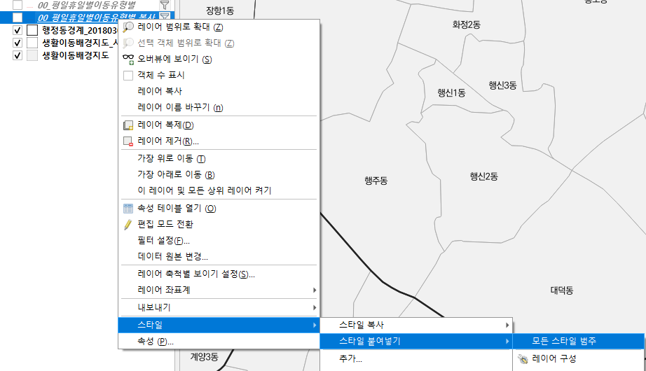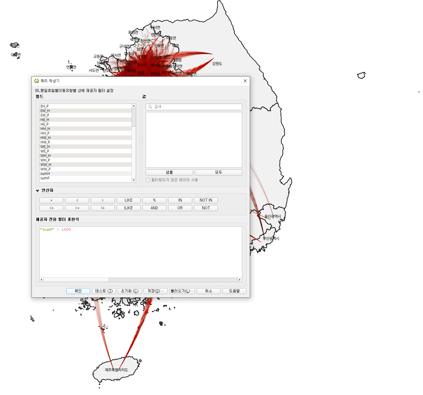 시군구 경계와 시도 경계는 면은 투명하게 두고 선만 칠하면 된다. 당연히 두 개 모두 생활이동배경지도.shp 보다 레이어상 위에 위치해야 한다.
