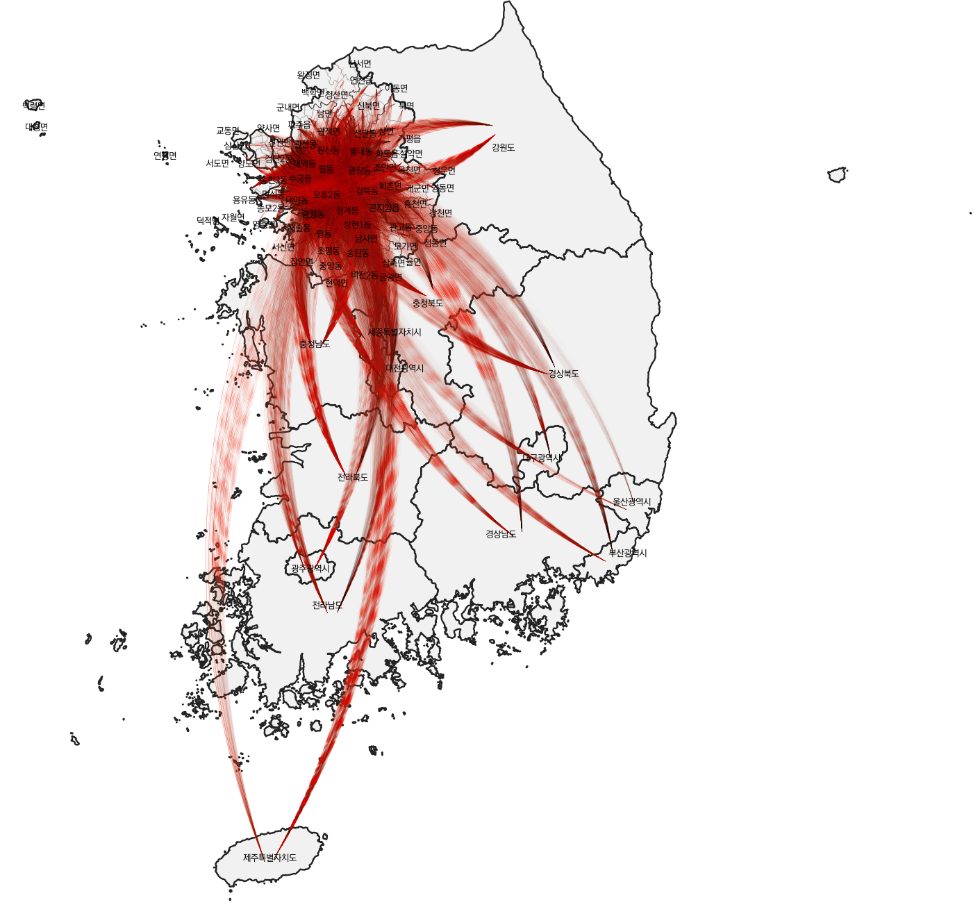 지도 위에 데이터를 표현할 때 아주 까다로운 대상 중 하나는 OD 데이터다. Origin-Destination 데이터는 지도 위의 두 지점을 선으로 이어야 한다. 노드와 링크가 있는 추상공간 위의 네트워크 시각화