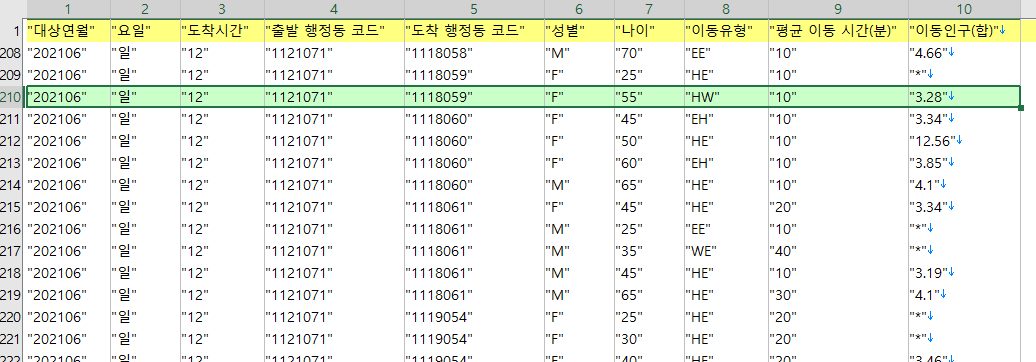 'popu'라고 표시된 곳이 바로 앞에서 잠시 언급한 이동량인데, 3이하가 별표(*)로 처리되어 있으므로, 미리 그 값을 NA 로 읽어들이면 편하다. 그래야만 데이터 형식도 character이 아니라 numeric으로 유지할 수 있다. 이런 내용을 지정한 부분이 바로 [na.strings] 이다.