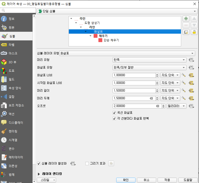 라인을 선택하고 오른쪽에 녹색 + 버튼을 클릭한 후, 심볼레이어 유형에서 '도형생성기'를 선택한다.