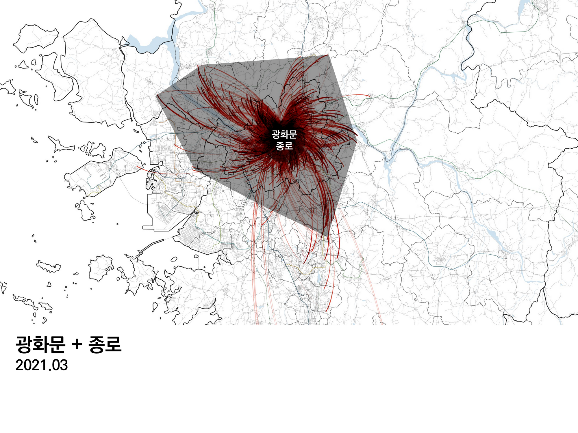 광화문과 종로 지역을 오고간 이동만 걸러내면 상권, 혹은 출근 권역이 보인다. 검은색 다각형은 적당히 손으로 그린 것으로, 대략적인 권역을 '적당히' 그려보았다.