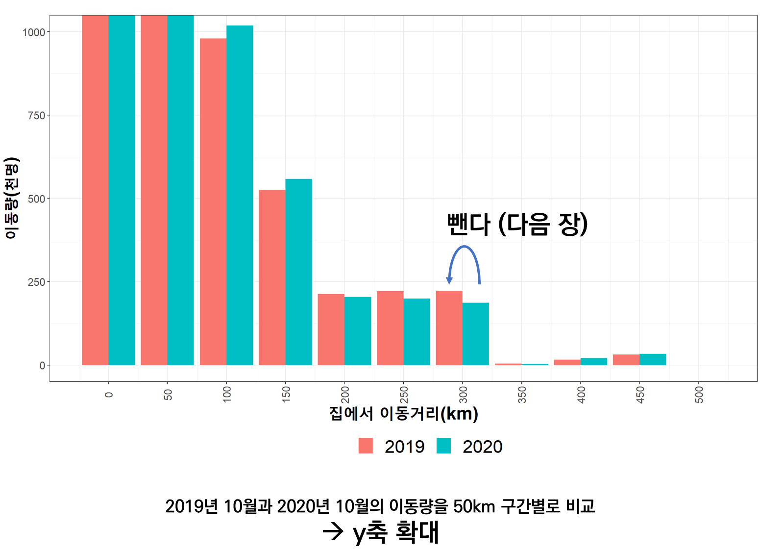 150km 구간까지의 이동은 근소하게 많고, 200km~350km 구간까지의 이동은 줄어들었다. 차이가 잘 안보이므로 2020년에서 2019년의 이동량을 빼서 다시 그려보겠다. 양수가 되면 2020년의 이동이 해당 구간에서 더 많았음을 의미하게 된다.