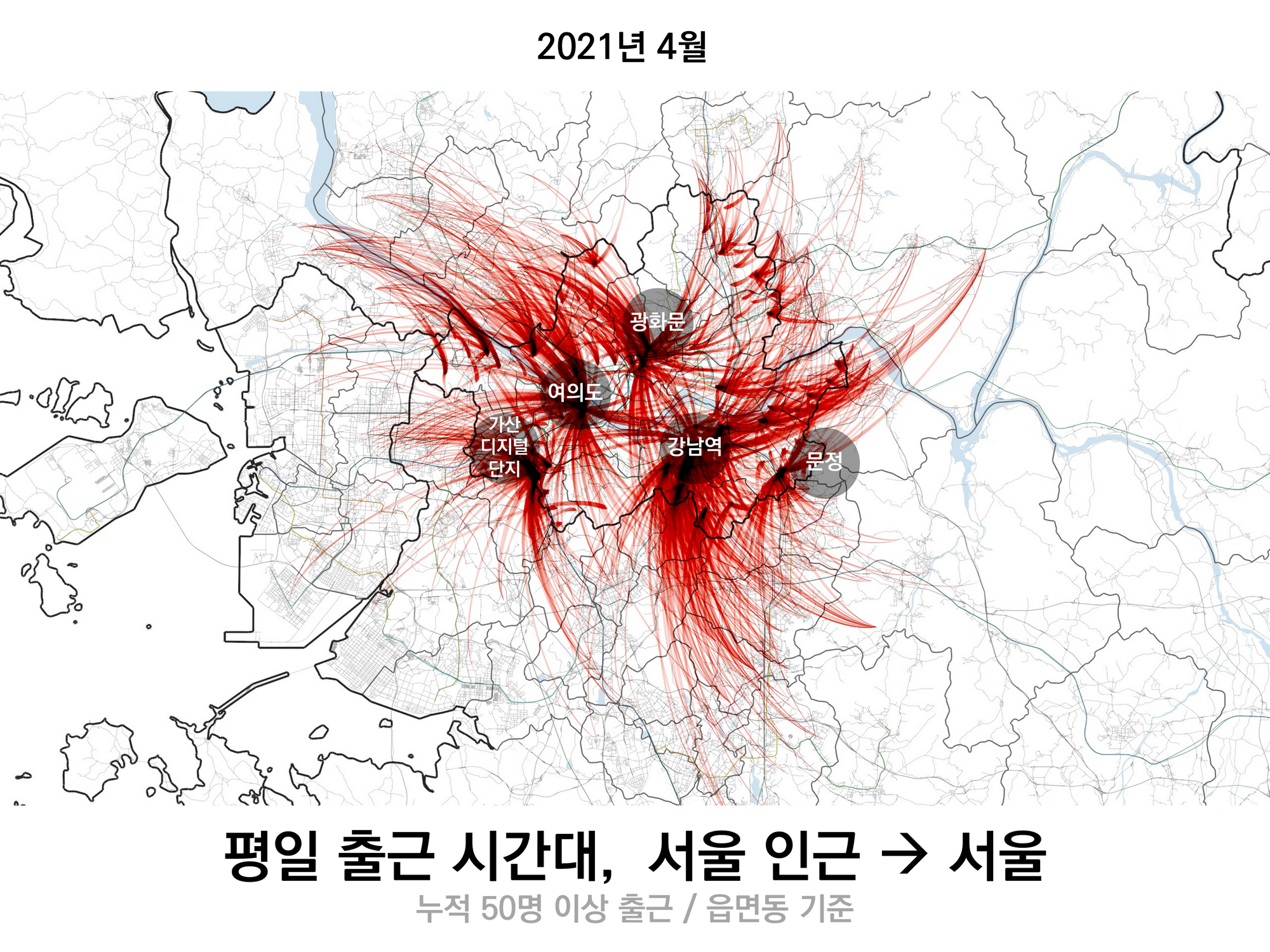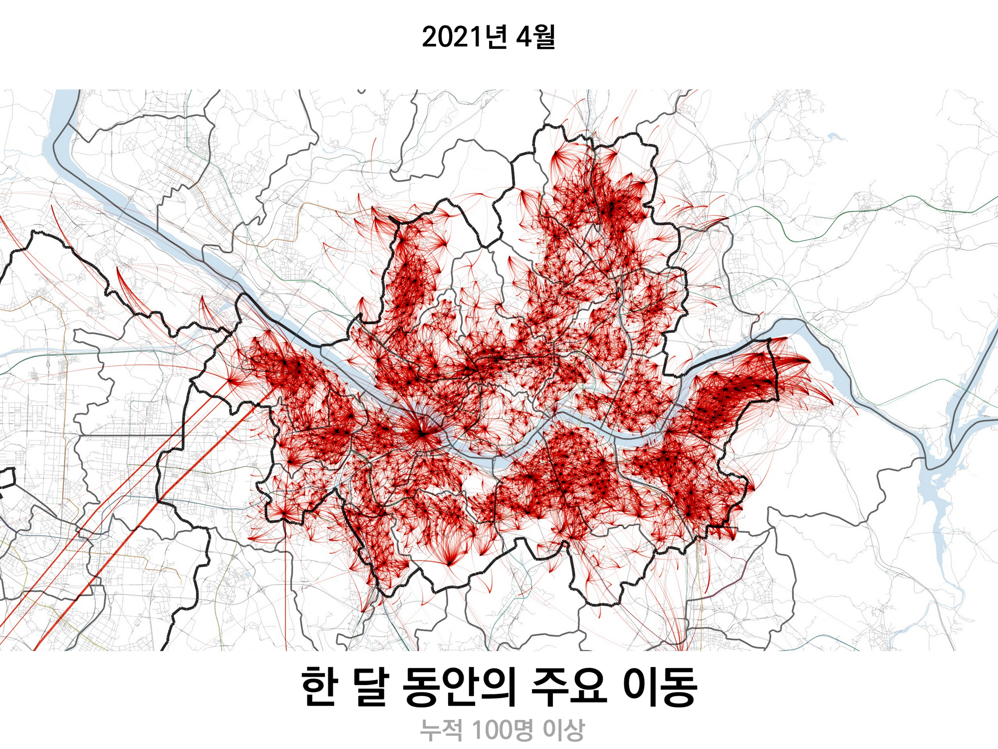 서울에서 출발하거나 서울로 도착한 이동이 하루에 2000만회 정도 있는데, 2021년 4월 한 달 동안의 모든 이동을 지도 위에 그려보면 아래와 같다.