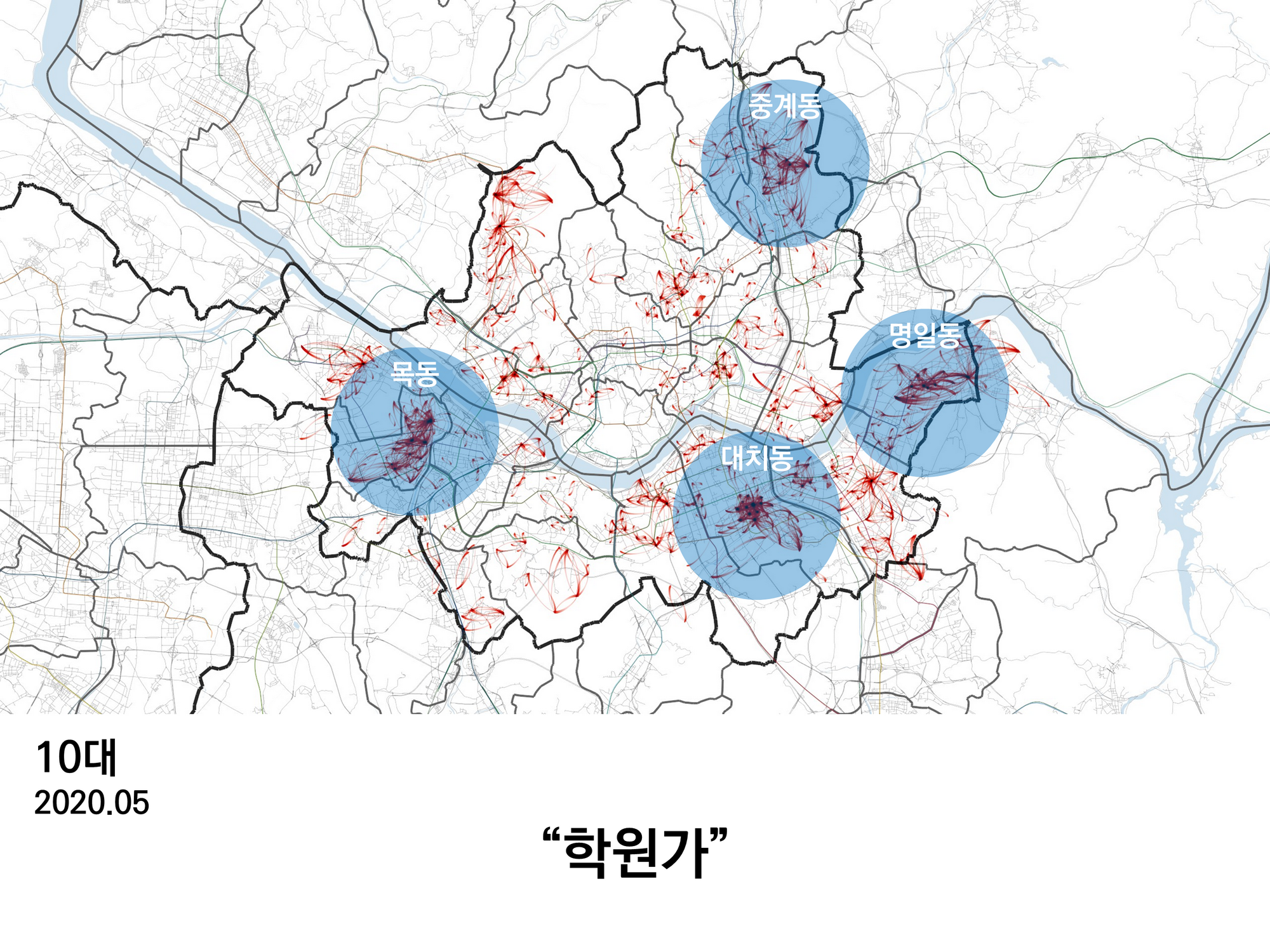 10대가 학교에 갈 때는 대부분 휴대폰을 꺼놓기 때문에, 휴대폰 시그널로 만들어진 10대의 이동은 주로 학원가에 집중되어 있다. 목동, 대치동, 중계동, 명일동 등 서울의 대표적인 학원가들이 보인다.