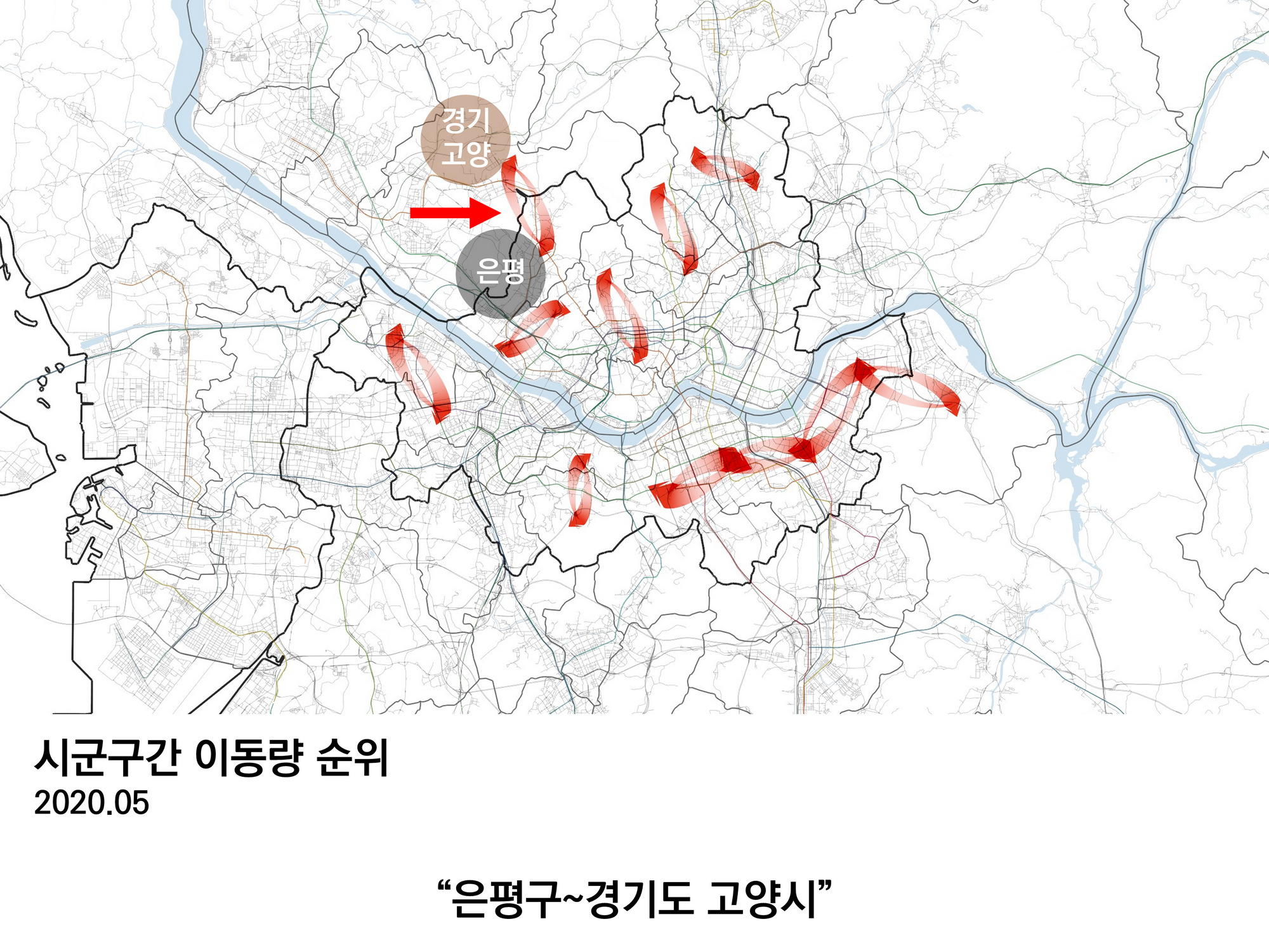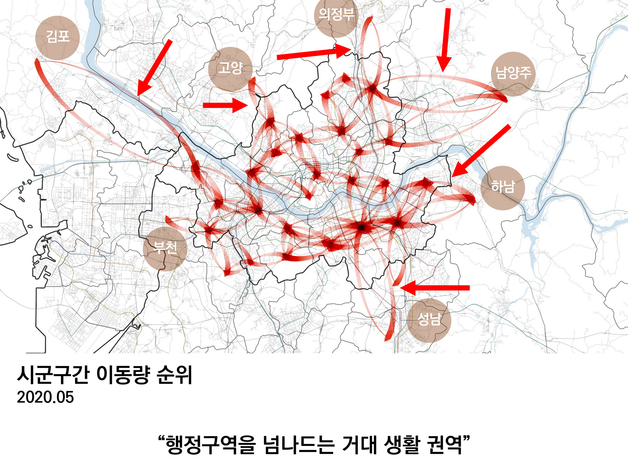 김포, 고양, 의정부, 부천, 남양주, 하남, 성남과 같은 시군구는 서울의 일부 지역들보다 이동량이 좀 더 많다. 이 그림에서는 아직 한강을 넘나드는 이동들이나 성동구와 중랑구들이 연결되지 않았다. 따라서 그림에 보이는 경기도 지역들은 그보다 더 긴밀하게 서울과 연결된 곳이라고 할 수 있다.