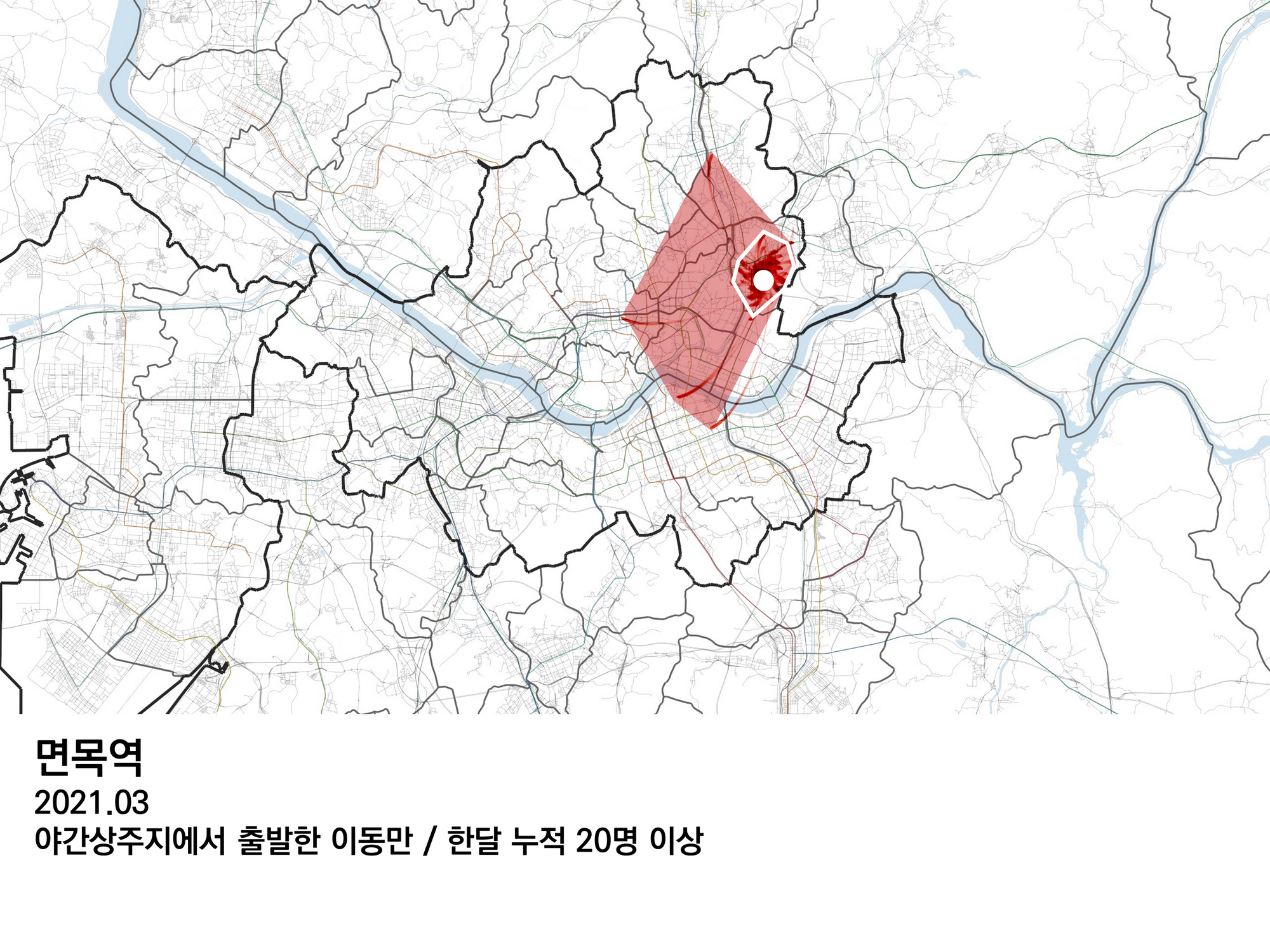 면목역 같은 경우에는 서울 외부보다 서울 내부 방향으로만 생활권이 뻗어 있다. 7호선을 따라 움직이는 것 같으면서도, 동대문 쪽으로는 직결된 지하철이 없음에도 불구하고 많은 이동을 보여준다.