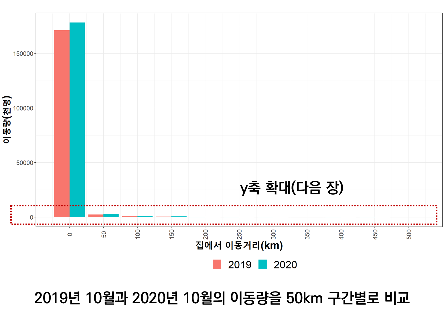 위의 그림처럼 대부분의 이동은 거주지로부터 50km 이내의 이동이다. 코로나로 인해 먼 곳을 잘 가지 않았는지, 2019년보다 2020년에 50km 이내의 이동량이 늘어났다.