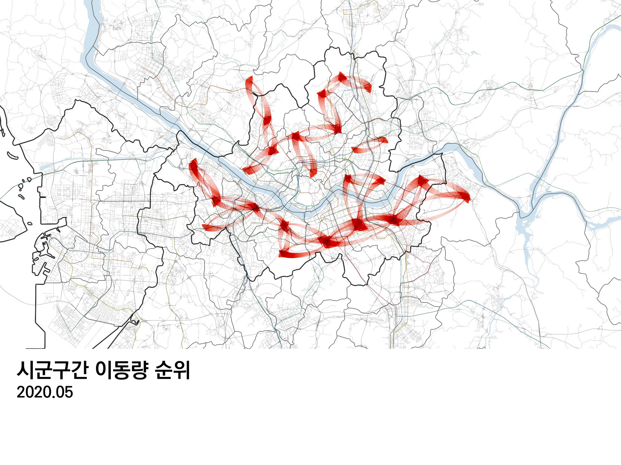 위의 그림에서 서울 부분을 확대했다. 이동이 워낙 많으므로, 교통폴리곤 단위로 하루 평균 100명 이상 이동한 경로만 남겼다. 대부분의 사람들은 주변 지역으로 많이 오고간다. 어렴풋이 클러스터들도 보이는데, 강을 잘 건너지 않는 등 물리적 지형지물의 영향도 받는 것 같다. 단, 여의도는 마포구,용산구와 긴밀하게 연결되어 있다.