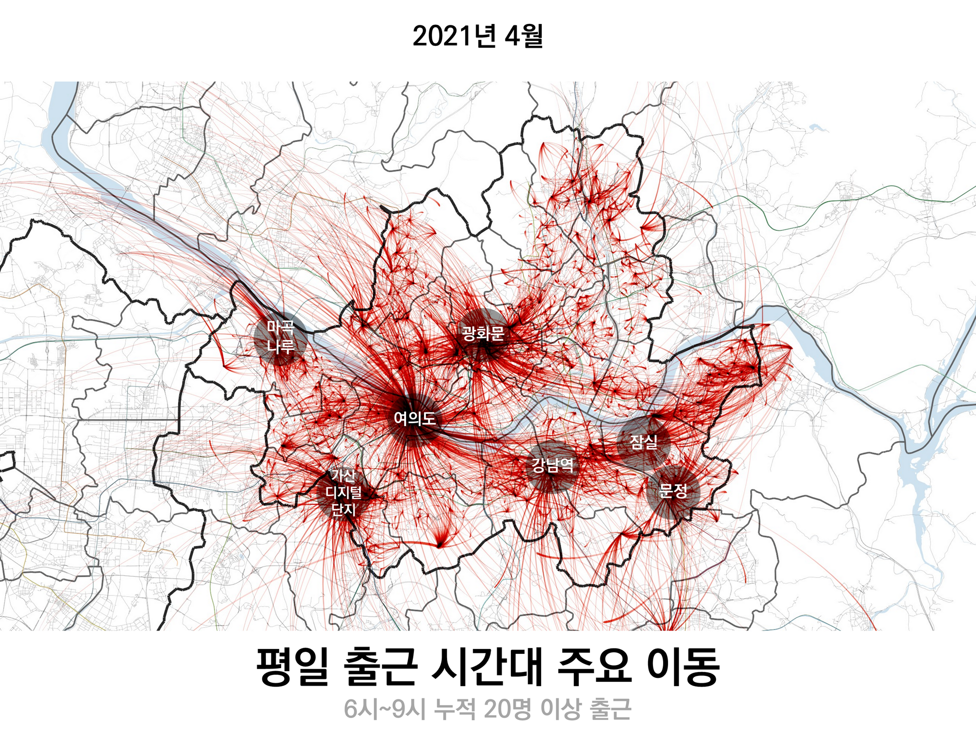 이번에는 이동의 속성 중 HW, 즉 출근 및 등교 이동만 필터링한 후, 6시~9시에 출발한 이동들만 그려보았다. 역시 모두 그리면 선들을 분간할 수 없으므로 하루 평균 20명 이상 출근하는 경로들만 남겼다.