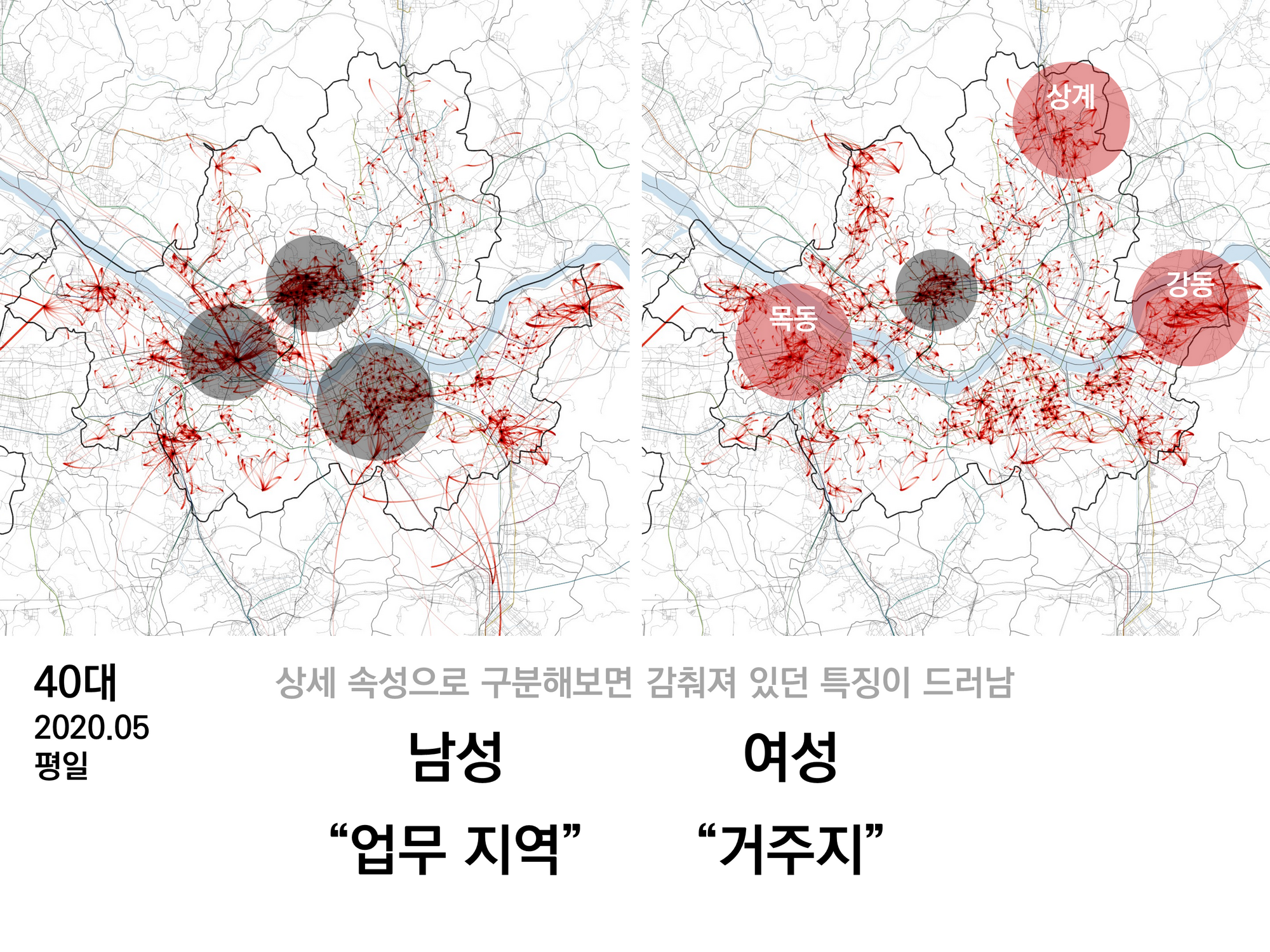 40대의 이동 중 평일만 필터링한 후 성별로 구분해보면, 앞서 섞여있던 이동이 다시 지역적으로 어느정도 분리된다. 남성은 업무지역 위주로 이동하고, 주거지역에서 잦은 이동을 보이는 사람들은 주로 여성임을 알 수 있다. 결혼을 하고 가정을 이루면서 자식을 낳으면서 사회적인 역할이 달라지는 경우가 많기 때문에, 위처럼 특정 나이대의 성별 이동은 지역적으로 분리되기도 한다.