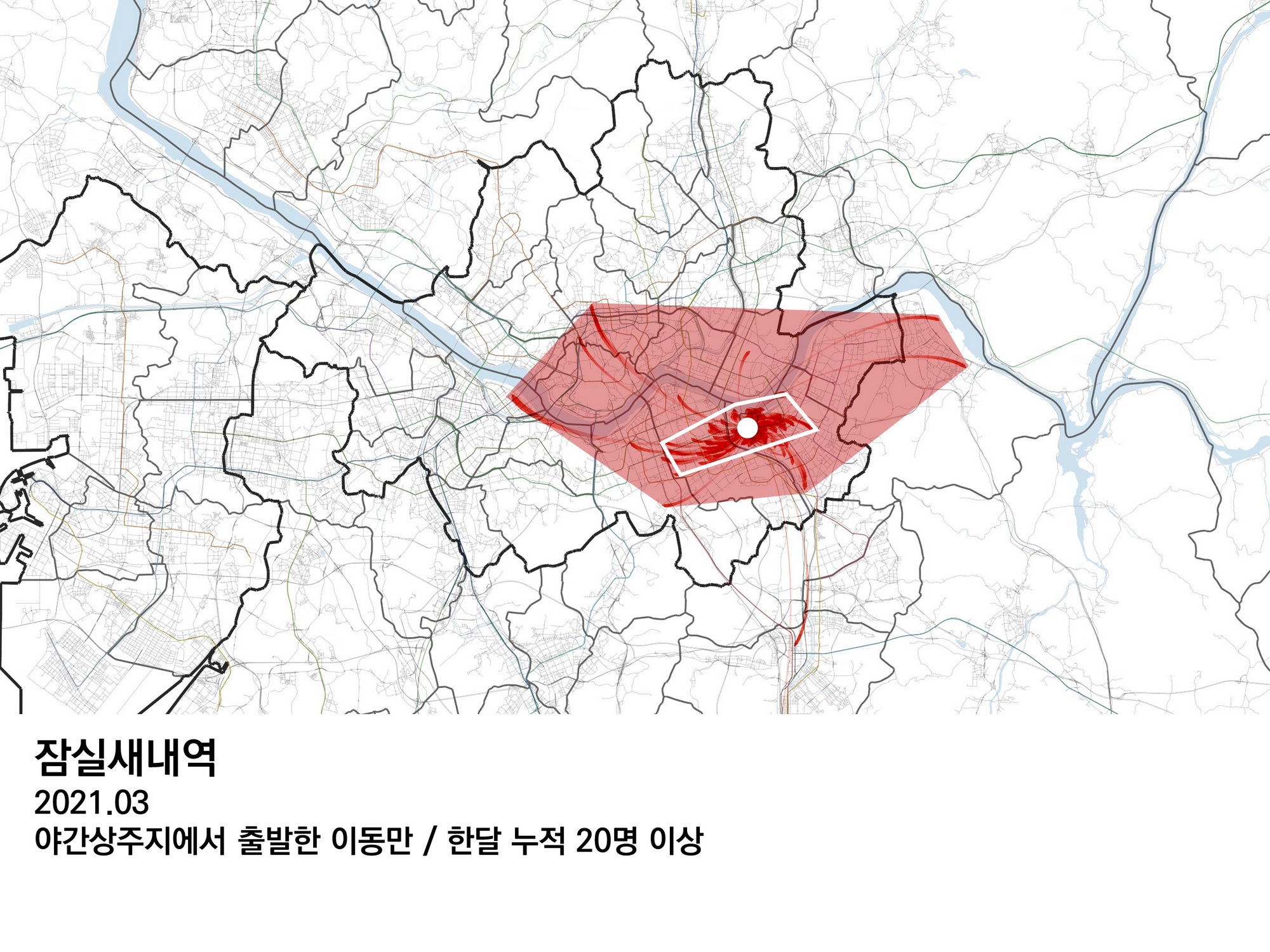 가까운 곳과의 이동이 많고 먼 곳과의 이동이 적은 것은 당연한 이치다. 그렇지만 이동의 빈도는 동서남북으로 고르게 멀어지면서 줄어들지 않고, 교통의 연결정도에 따라 다른 정도로 줄어들면서 이지러진 다각형의 생활권을 만든다. 혹은 위 그림처럼 잠실새내역에서는 중간 지역을 건너뛰고 광화문이나 여의도처럼 직장 밀집지역과 좀 더 긴밀하게 연결되기도 한다.