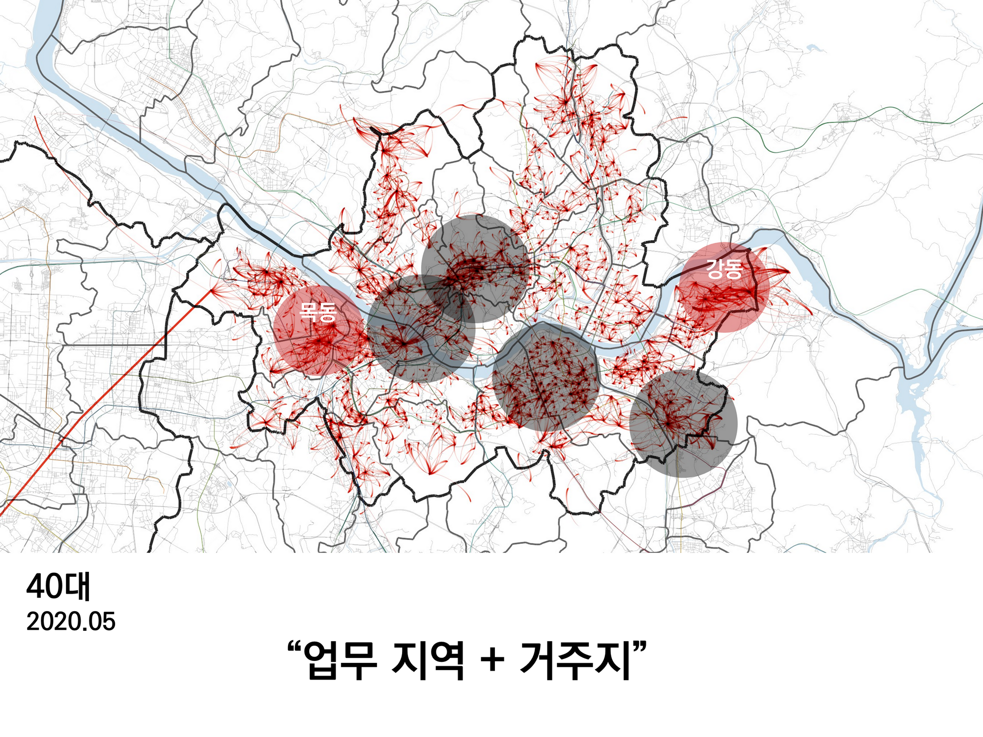 40대의 이동은 30대와 마찬가지로 직장밀집지역도 있지만, 지도에서 붉은색 원으로 표시된 곳들 역시 이동이 많이 관찰되는데 목동이나 강동구는 주거지역이기도 하다.