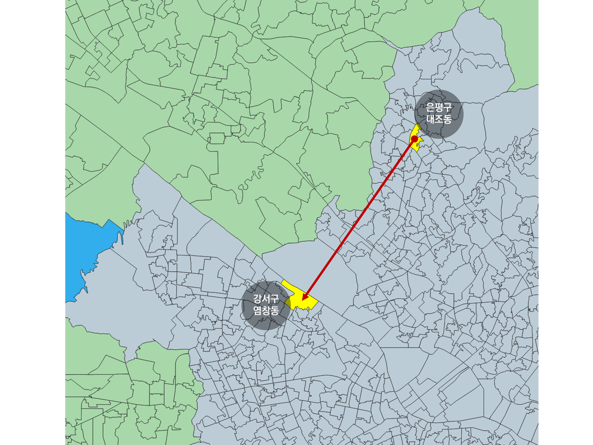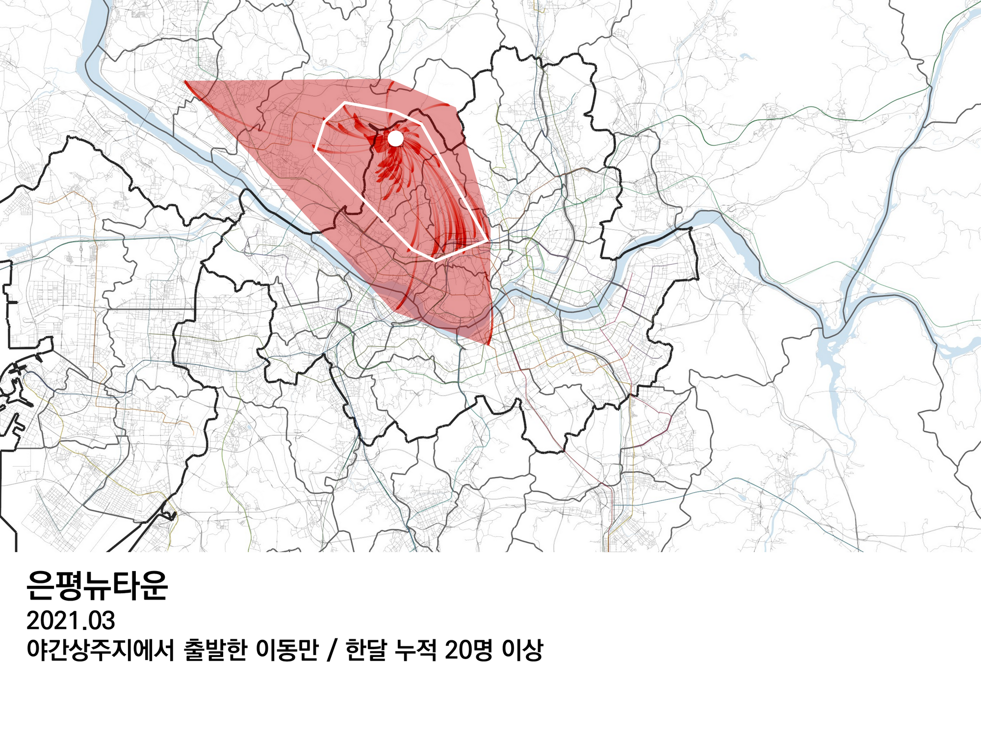 은평 뉴타운은 광화문과 종로 곳곳으로 많이 이동한다. 고양시 쪽으로도 이동이 많다. 서울 내부와 외부로 함께 확장된 특이한 경우에 해당한다.