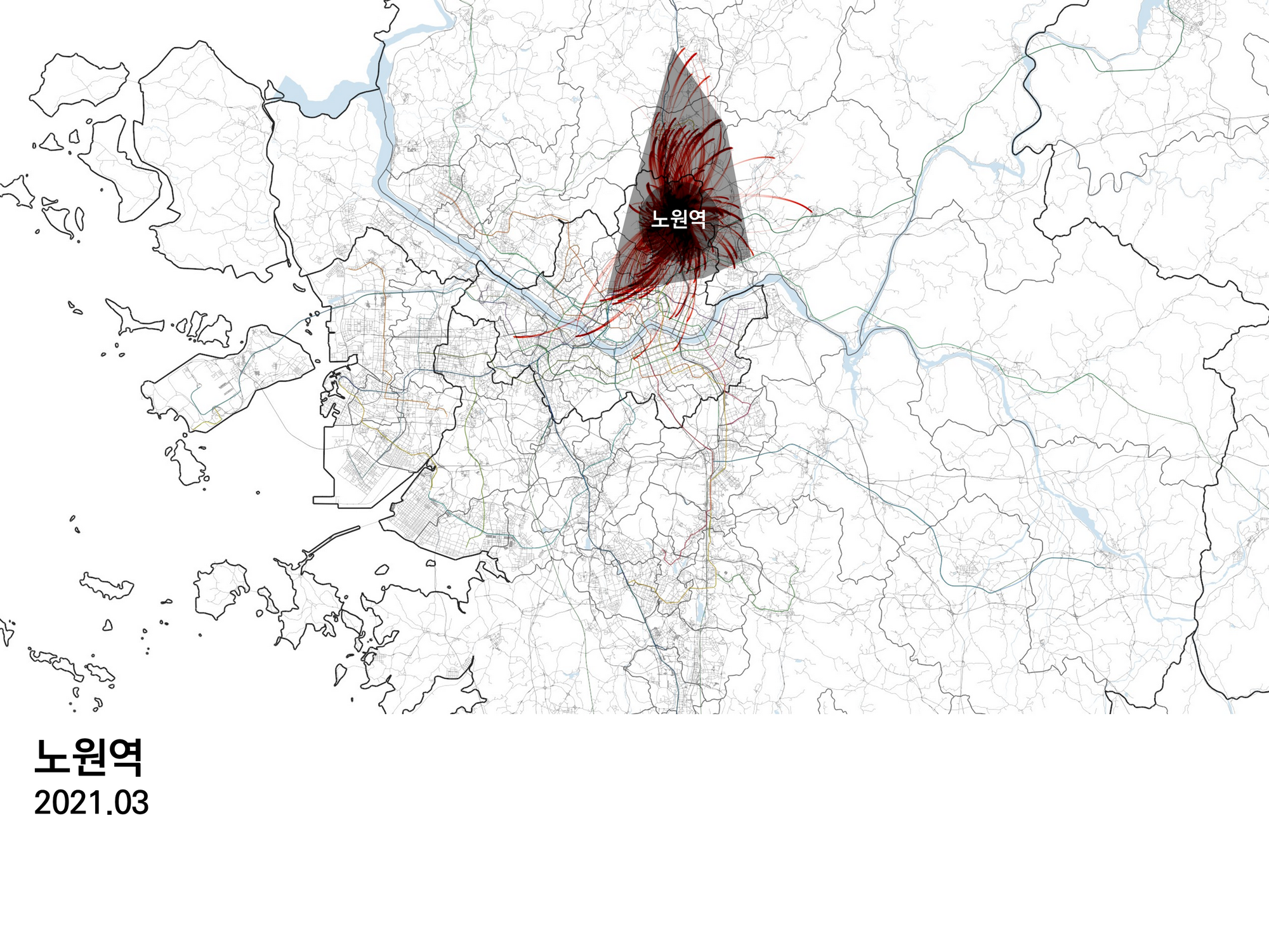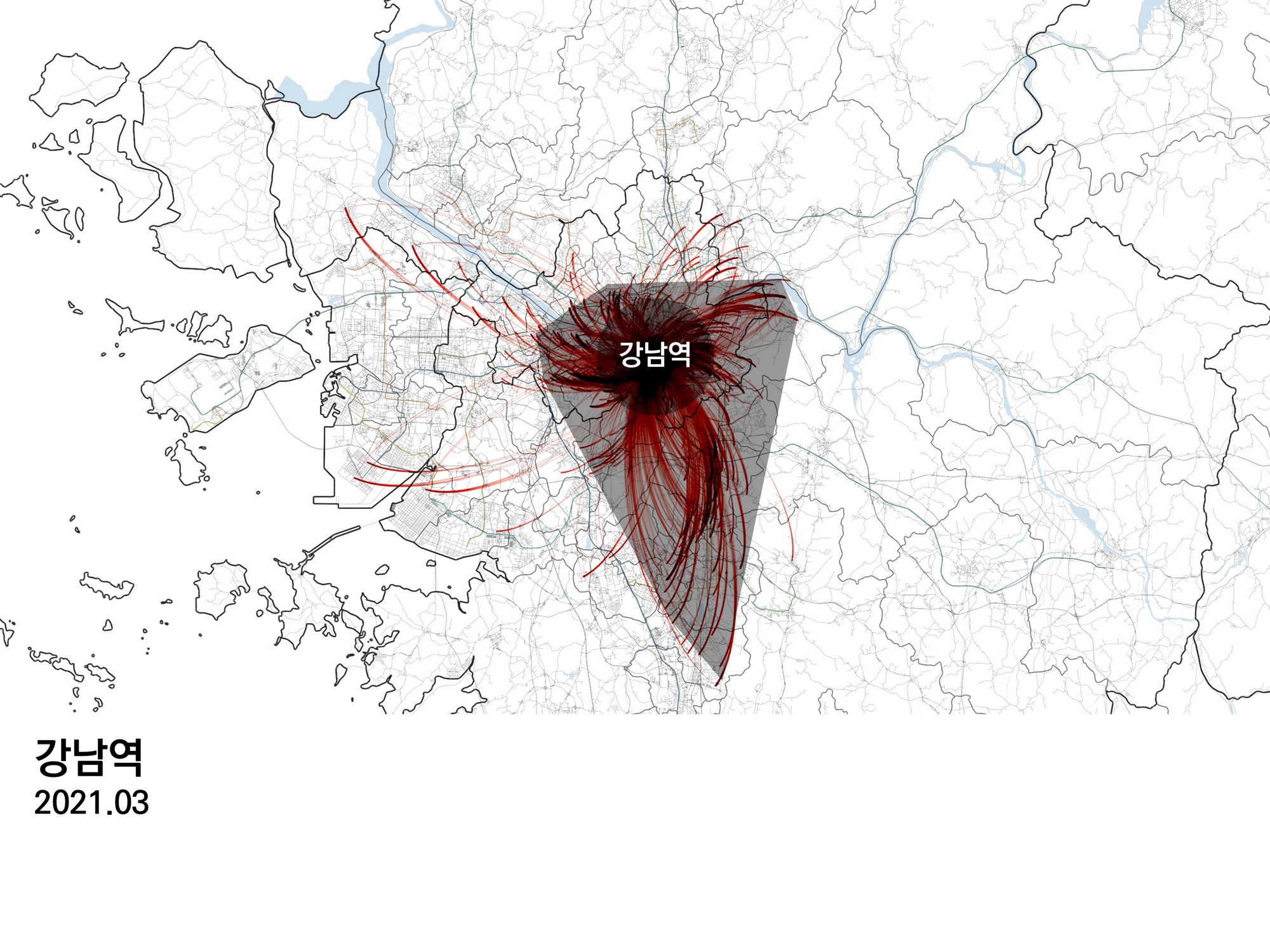 종로와 강남역을 비교해보면 확실히 권역이 차이가 난다. 강남역은 남쪽으로 수원까지 뻗어 있다.물론 동쪽으로 송도나 김포까지 오가는 이동도 보이는데, 수원 방향으로 좀 더 강한 방향성을 보인다.