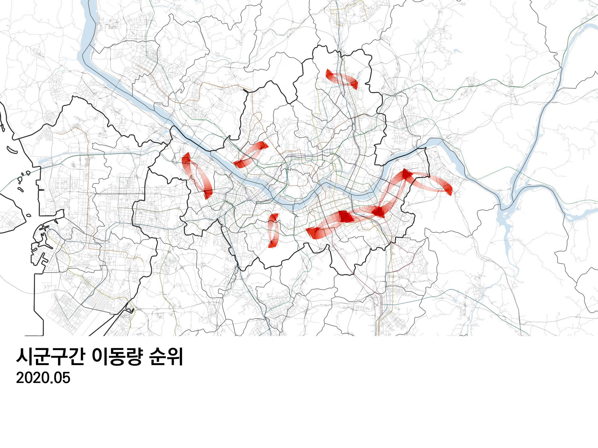 서울 내부의 이동이 워낙 많으므로 진하게 겹쳐져 나타났고, 멀리 제주도, 부산, 강릉에도 오고가는 사람들이 많다. 제주도와 오가는 이동은 서울 시민인 경우도 있고, 제주도민일 수도 있으며, 인천 사람이 김포공항에 가서 제주도로 이동했다면, 그 이동 또한 포함된다.