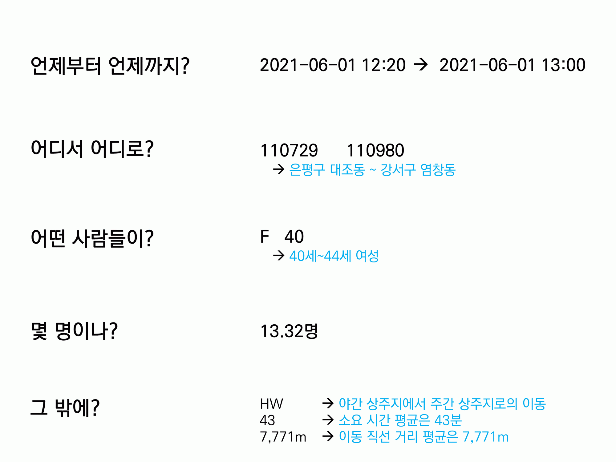 기본적으로, 언제 어디서 어디로 얼마나 어떤 성별과 어떤 나이대의 사람들이 이동했는지 나와 있는데, 야간상주지와 주간상주지를 추정해서 이동에 속성을 붙인 점이 특별한 부분이다. 예를 들어 HW는 야간상주지에서 주간상주지의 이동을 의미하고, 일반적으로 우리는 이러한 이동을 '출근'이나 '등교'라고 부른다. WH는 주간상주지에서 야간상주지로의 이동이며, 퇴근/하교라고 할 수 있다.