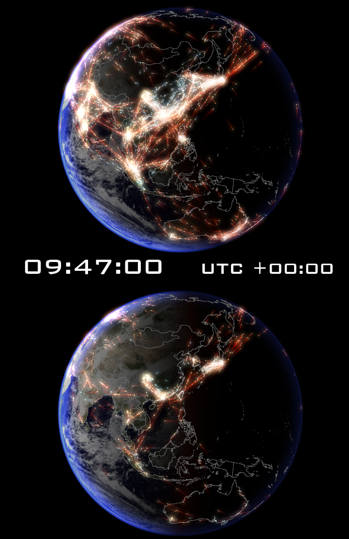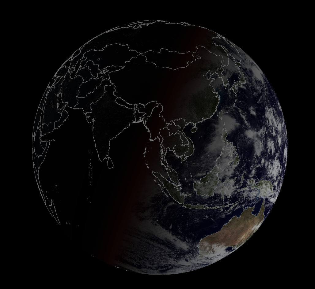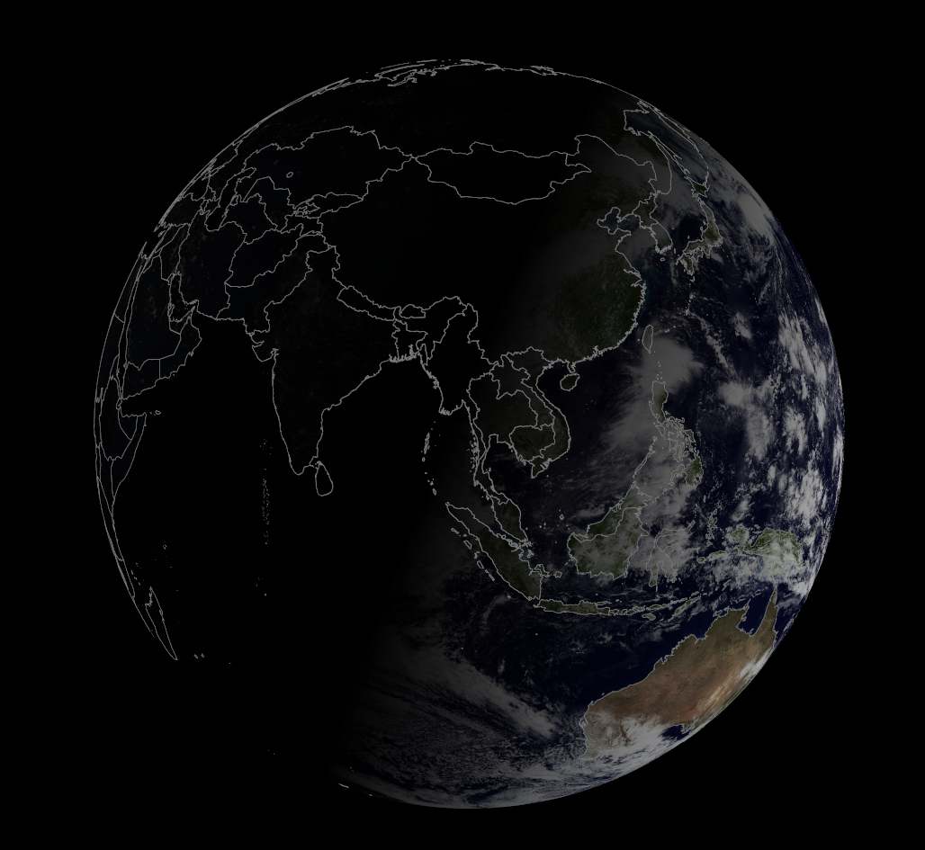 위의 이미지가 낮과 밤 이미지 없이 가장자리 부분만 표현한 이미지다. (선으로 된 지도가 지구 반대편과 겹쳐서 약간 복잡하게 보인다.)