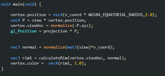 재귀적 호출을 통해 마지막 레벨인 if (level==0) 구간에 도달하게 되면, 각 정점의 좌표를 normalize 하는 과정을 거쳐 배열에 입력된다. 이 정점은 glDrawArrays를 통해 그대로 셰이더로 보내고, 지구의 반지름은 셰이더에서 곱해주게 된다.