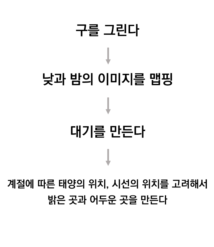 마지막 단계라고 설명한 부분은, 사실 두번째 세번째 단계에 이미 포함되어 있다. 낮과 밤의 이미지를 맵핑할 때 태양의 위치에 따라서 두 이미지의 픽셀값을 취사선택해야 하기 때문에 이미 수식에 해당 변수들이 포함되어 있어야 한다.
